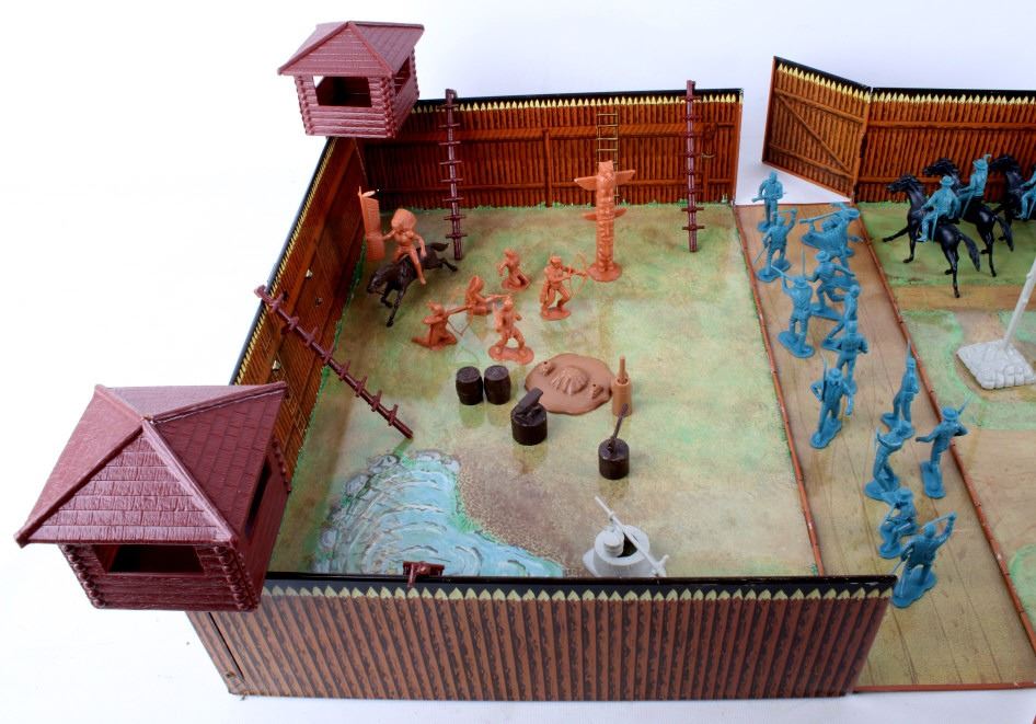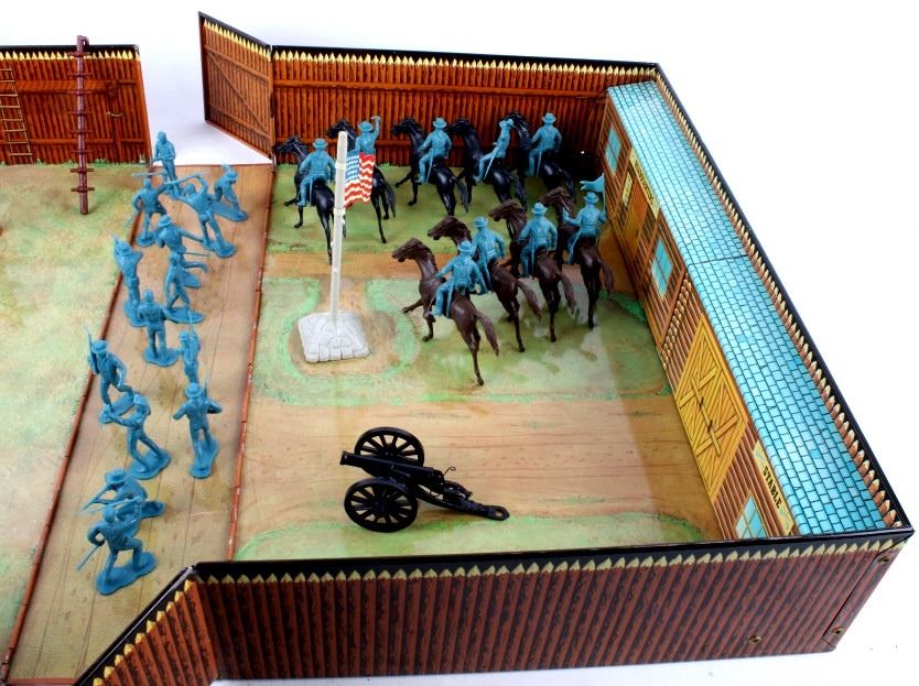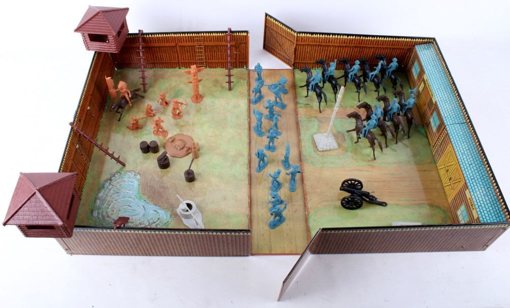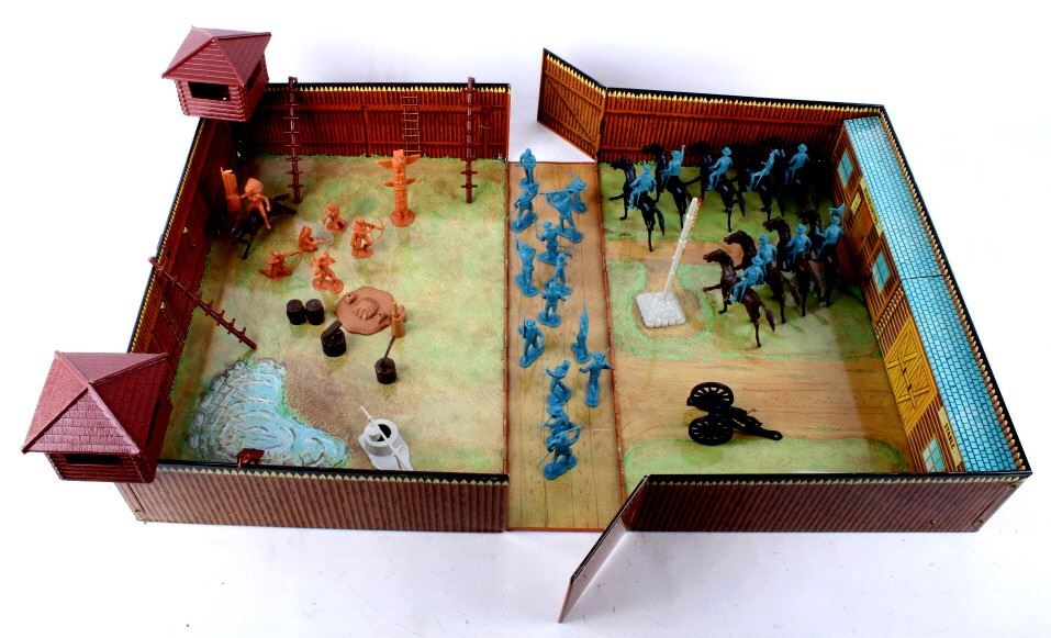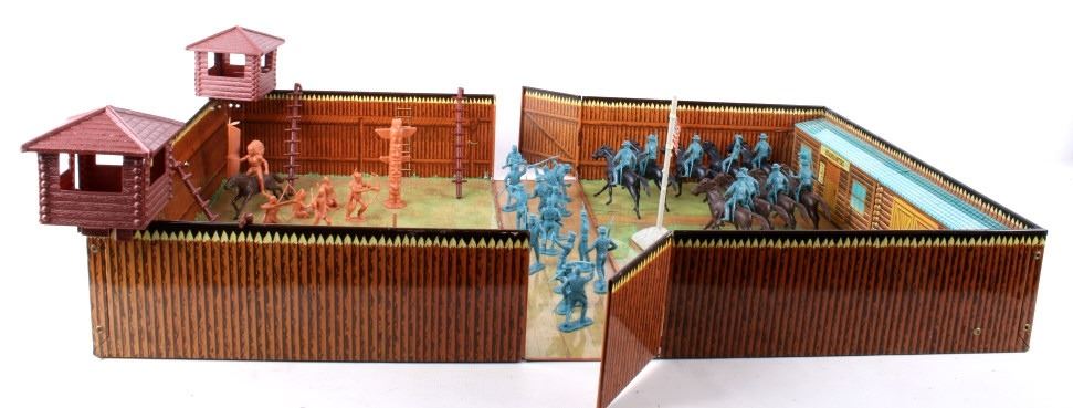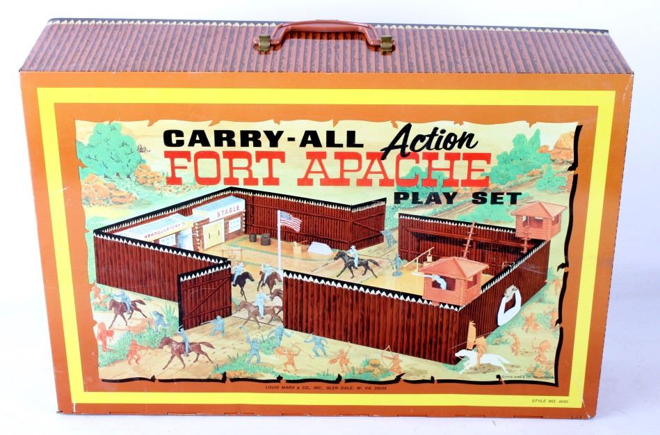 In this lot for your consideration is a Carry-All Action Fort Apache play set circa 1960. The set includes four fort building parts, one flagpole with flag, one well and bucket, four ladders, one pile of logs, one canon, one butter churn, one campfire and pot, a barrel of gunpowder, an anvil, a hatchet in a stump, five brown horses, five black horses, a totem pole, six Native American warriors and 26 Fort soldiers. The case folds open to make the Stockade of the fort. The standing figures are 2 1/4" tall and the horses are 2 1/2" tall. The latch and one rivet on the side of the metal box is missing but other than that the collection is in very good shape. The box measures 19" x 13" x 4 1/4".