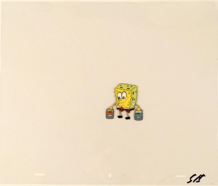 To create production cels, the original animator's drawing is transferred onto an acetate cel (by hand-inking and/or photo copying). The cel is then hand-painted on the reverse side. The cel is ready to be matted and framed. The animator's notations are at the bottom of the cel. There is slight paint fade to the outline of Spongebob.