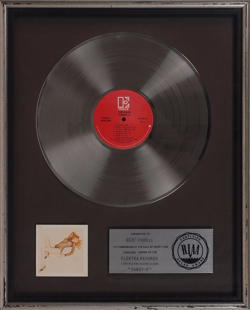 Official floater-style RIAA platinum sales award presented “to commemorate the sale of more than 1,000,000 copies of the Elektra Records long-playing record album ‘Candy–O.’” Framed with its disc, plate, and a small image of the album cover to an overall size of 16.75 x 20.75. Award retains its original backing with a Creative Glassics label. In fine condition.