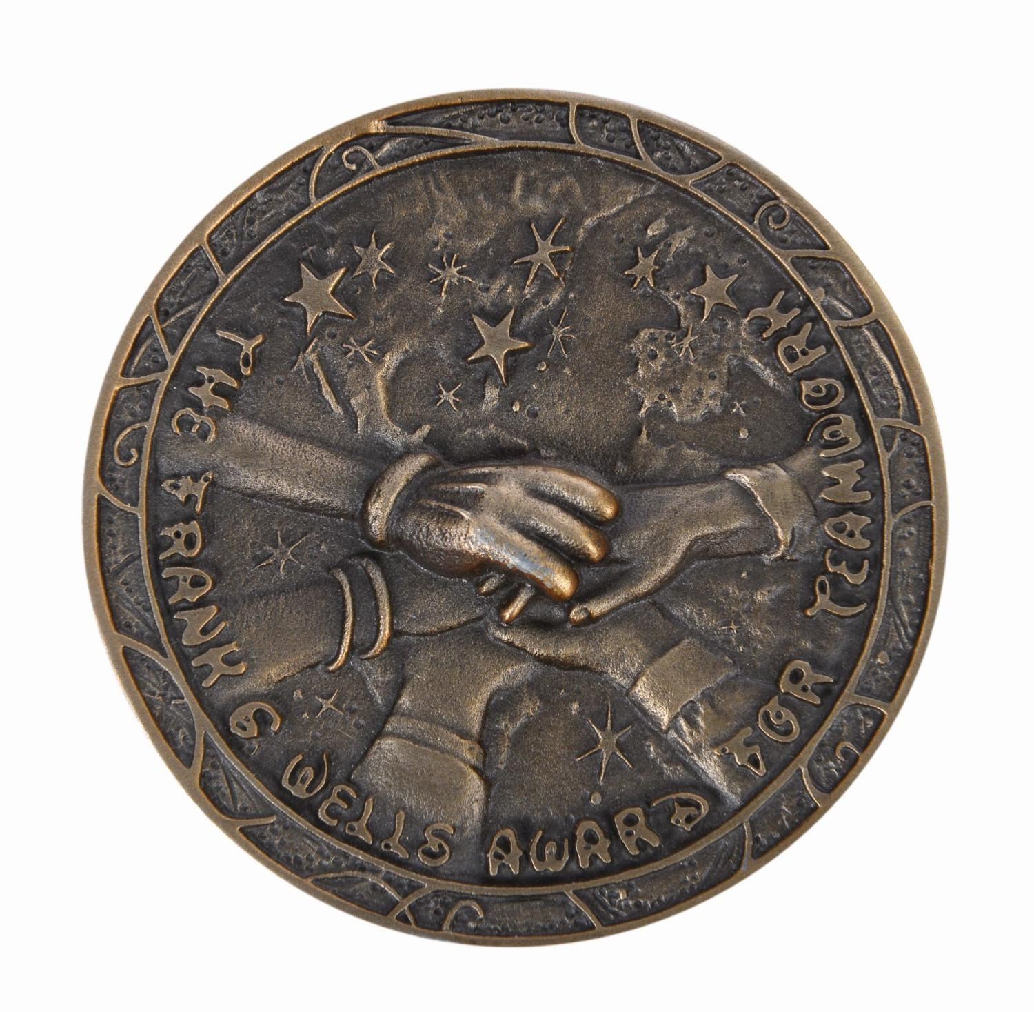 (California Adventure, 2012) A rare project team medallion presented to the team behind Cars Land at California Adventure. The coin features Lightning McQueen and Mater on the front, while the reverse features the title "The Frank G. Wells Award for Teamwork." Measuring 2.5" in diameter, the metal coin is in good condition with some peeling to the coating of the metal along the perimeter. A wooden display stand is included.