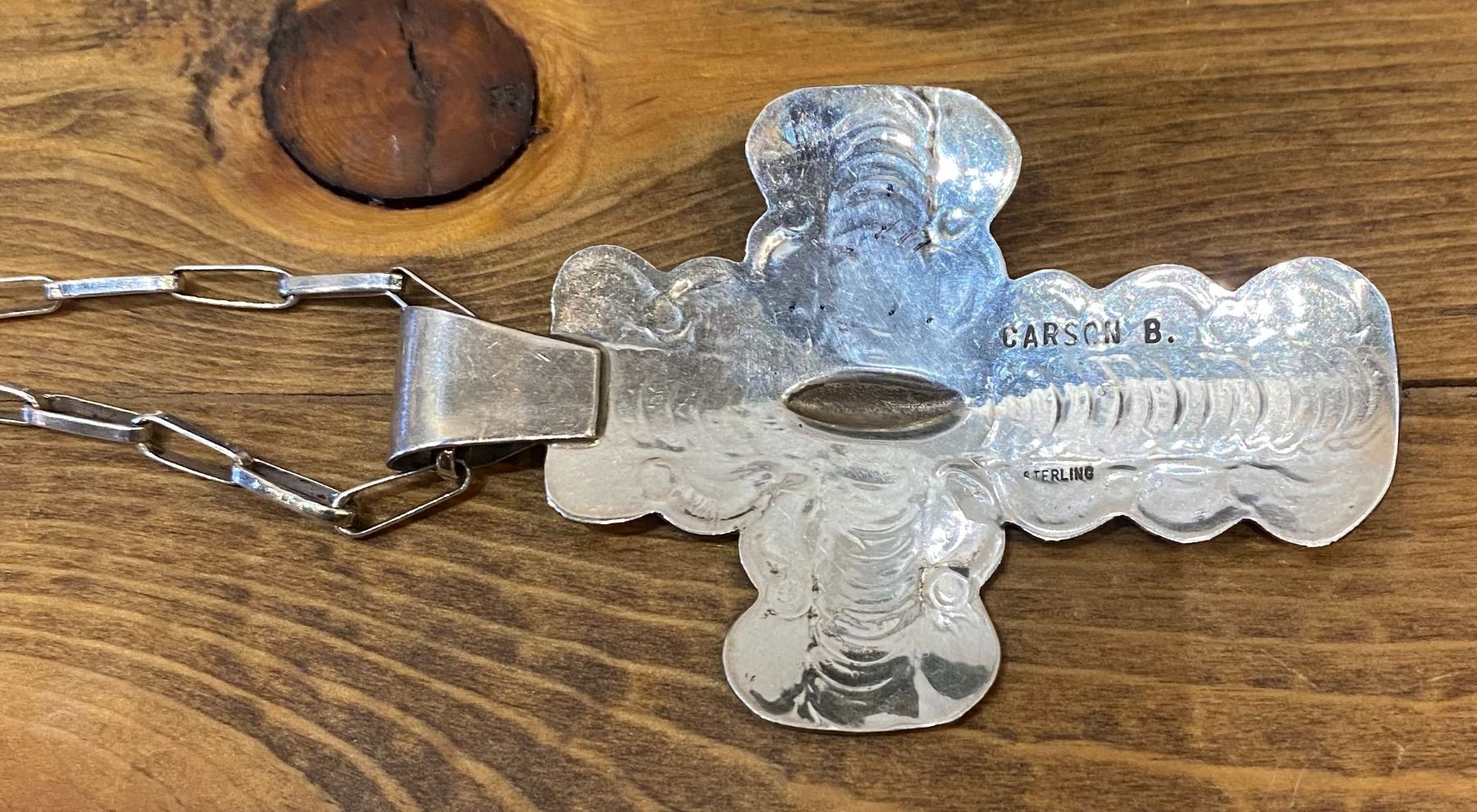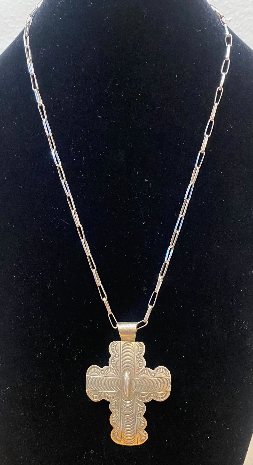 Carson Blackgoat Navajo Artist 3” X 2” Cross with stamping. Included a 24-inch sterling link necklace done by Mildred Parkhurst, Navajo. 24 grams