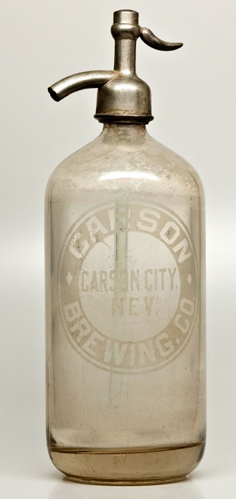 Measures 11.5", with top, by 4". Etched glass reads CARSON BREWING CO. CARSON CITY, NEV. This frosted glass logo is one of the oldest from this particular brewery. A second rare clear seltzer is known from this soda water producing period. It has blue silk screened letters and may date from the late Prohibition period [Ref: Nevada History Through Glass, Vol I, Fred Holabird, 2012]. -59427