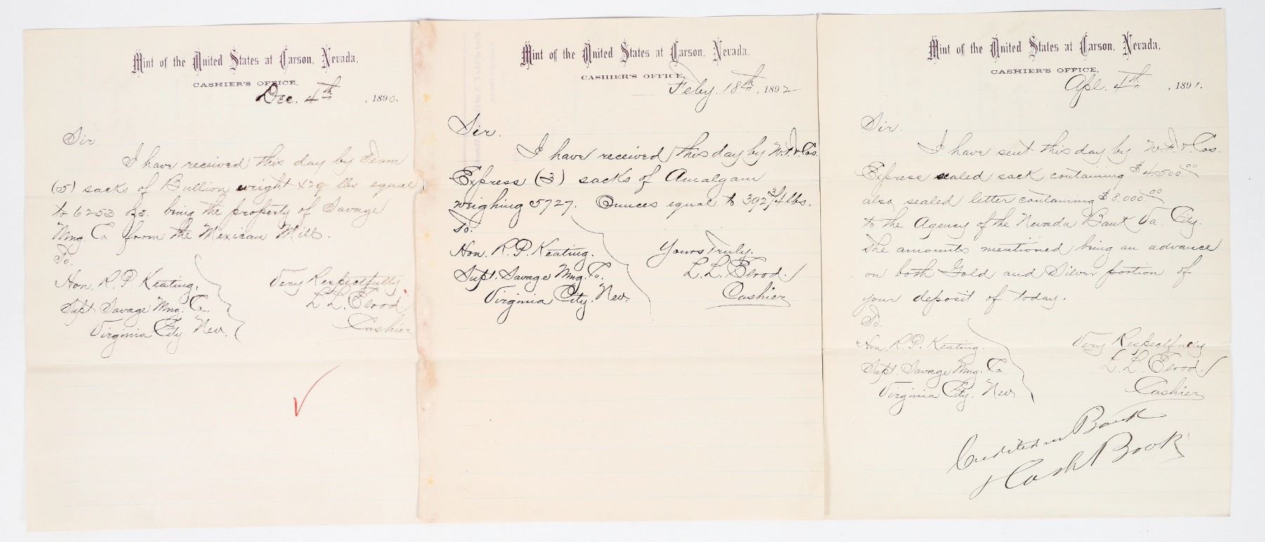Lot of 3. All are addressed to RP Keating, supt. of the Savage Mine in Virginia City, from LL Elrod, cashier at the CC Mint. Two letters are about receiving amalgam to the Mint (one from the Mexican Mill). The third letter is about the Mint sending coin via Wells Fargo to VC as payment for deposits. One letter has soiling/water damage.