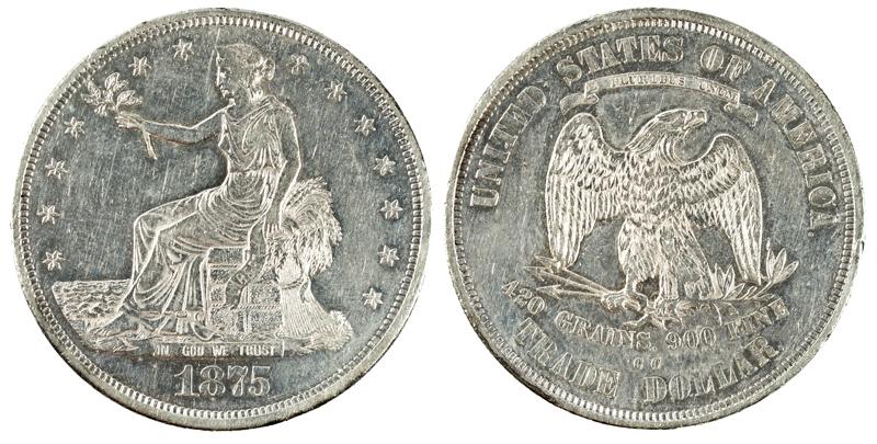 Uncertified trade dollar. Extremely fine to almost uncirculated. Cleaned.