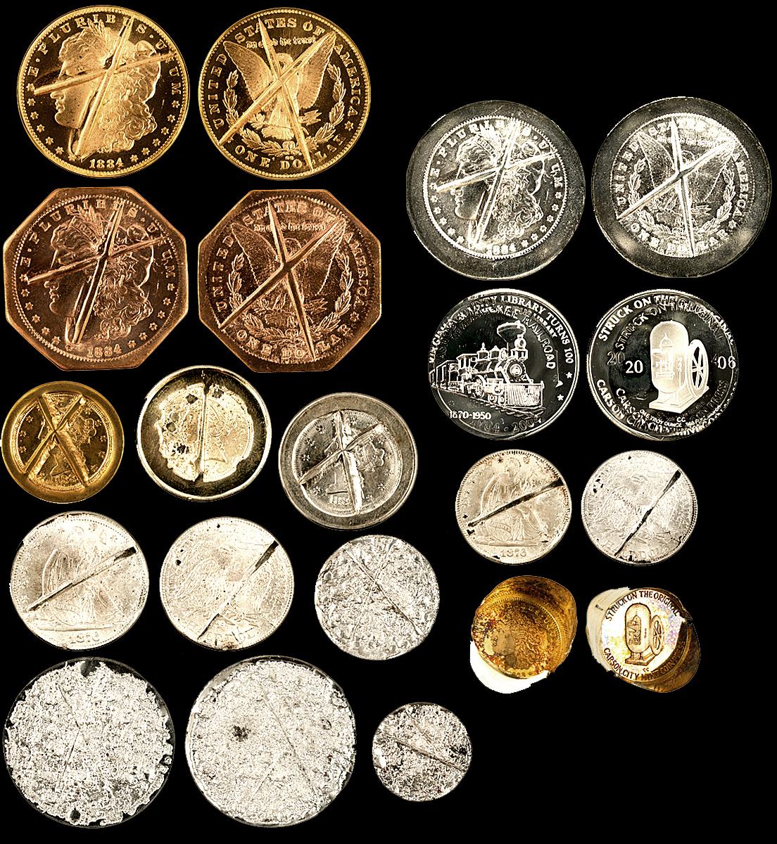 10) 1884 Morgan cancelled obverse and 1878-CC cancelled reverse on silver 1oz planchet. Very few struck on 1oz silver with cancelled die strikes. Coiner Don Schmitz struck less than 50.
