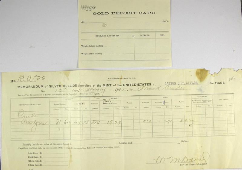 Crude amalgam assay receipt from the United States Mint at Carson City dates January 12, 1905. The crude amalgam was submitted by Frank Surbet. After melting the crude amalgam yielded 19.79oz of silver and .270oz of gold. The total value came out to be a whopping $5.02. This assay is numbered B.A.26 and is signed by WM David- for the superintendent. The receipt measured 14” x 5.5”. there is some considerable damage to the top of the paper where it appears to be slightly burned in addition to some rips in the edge. Also, there is a handwritten note attached to the assay receipt. The note is in regard to picking up money and checks that resulted from selling the crude amalgam. The original errand person was “laid up with a cold” so “MN” came down themselves. It was written on the obverse of gold deposit card. The note is small and measures 5.25” x 4”. The lot as a whole is in fair condition.