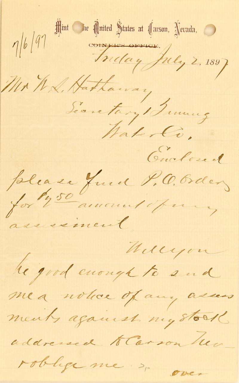 The letter is written on Mint letterhead and addressed to Mr. W.S. Hathaway, Secretary of he Banning Water Co. in Banning, CA. It is signed by Frank D. Hetrich in Carson City and regards his payment of assessments, and asks Hathaway to find a buyer for his stock lots. Measures 5 x 8” and has 2 holes punched at the top for keeping in a ring binder. Frank Hetrich held the post of assayer at the Mint at the time of its formal opening January 3, 1870, having moved to Nevada from Philadelphia where he had also worked in the assay department. In July 1873 he was given the job of superintendent, replacing Henry F. Rice, but only held that position until August of 1894, when he again moved, this time to San Francisco to accept a position in the Assay Department at the San Francisco Mint.