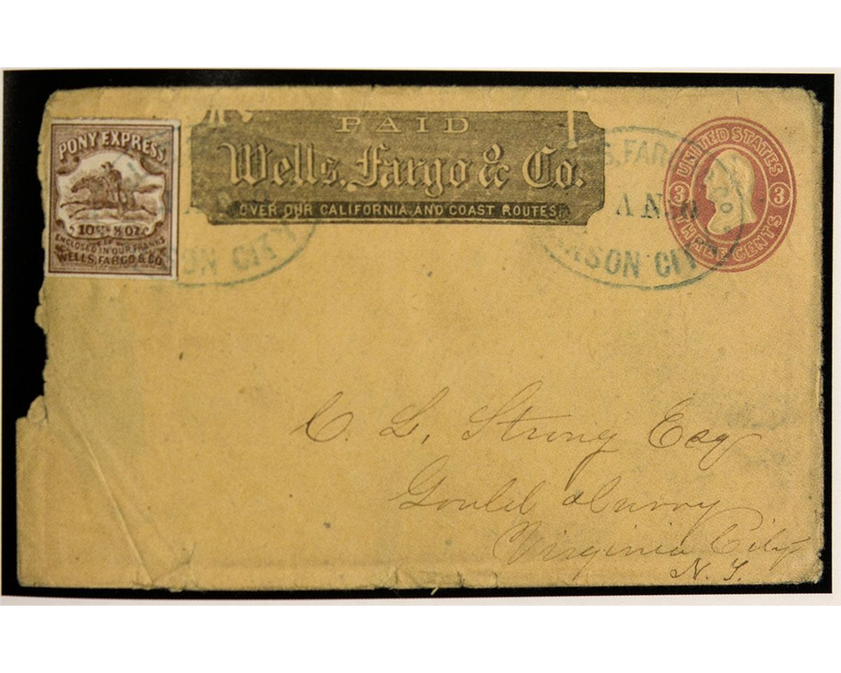 Extremely Rare Carson City Wells Fargo & Co.'s Express Pony cover with brown adhesive 10 cent Pony stamp at left, clearly tied. WF franked cover, rag left, unaffecting stamp, as original (most of these covers today have been professionally restored). 3 cent pink stamped buff envelope. Original contents included. The letter is to Charles Strong, superinenndant of the Gould & Curry Mining Co. in Virginia City. His wife was living in Carson, in this case worried about her husband's health. She mailed the letter in a hurry so as not to "be late for the Pony." As a probable 1863 cover, this piece takes on great significance. It was mailed at a time when the Gould & Curry were completing a major new mill built at the junction of Six and Seven Mile Canyons 2 miles below Virginia City. The mill was the first of many large mills (the rest built on the Carson River), but was the first to process high volume, high grade Comstock bonanza ores. News of the throughput of this mill (millions of dollars in just a short period of time) made national newspapers, and helped catapult the Comstock in national prominance. Unfortunately, the ore ran out, and the mill was sold off piecemeal about 1870. This cover was a new discovery within the past year. - HKA#66315