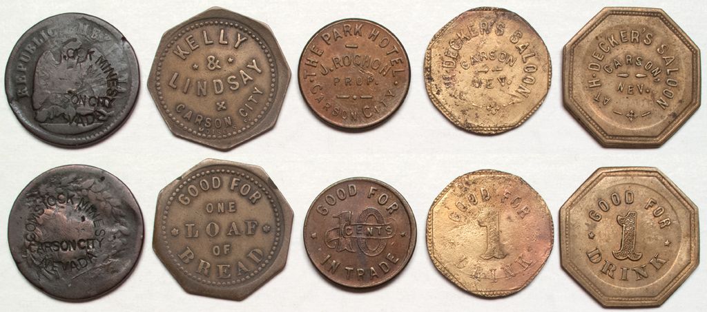 1) H. Decker's Saloon / Carson / Nev // GF 1 drink. Round. 2) H. Decker's Saloon / Carson / Nev // GF 1 drink. Octagonal. 3) Park Hotel / J Rochon / Prop / Carson City // GF 10cents IT. 4) Kelly & Lindsay / Carson City // GF one loaf of bread. 5) Very unusual token. 'Carson City',' Nevada' and company [difficult to read but ends with 'mine'] are all etched out of another coin that reads 'Republic of Nevada' with a picture of an eagle.City: Carson CityCounty: OrmsbyState: NVDate: