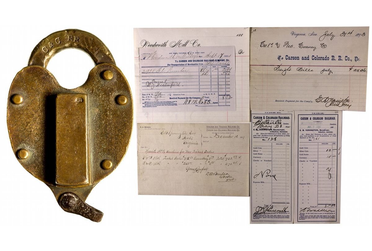 Carson & Colorado Railroad was incorporated 10 May 1880 and purchased by the Carson & Colorado Railway on 2 Aug 1892 [Ref: Poor’s Manual of Railroads, 1899, p. 722]. The C&C Railway was later sold to the Southern Pacific Company in 1900 by the parent company, the Virginia and Truckee Railroad [Ref: Wikipedia]. Lot includes: 1) Heart shaped riveted padlock, shackle front stamped “C&C RR” and rear stamped “LUX 6” with either a 6 or 9 on the drop. Spring-loaded drop and intact fob on lower body. The swing-away shackle, which was patented in 1877 by Yale and Towne, integrated mechanism, and riveted shell also date to the late 1870s. No information on the rear stamp is available. This lock appears to have been filed and re-punched on the shackle, and does not seem consistent with other known C&CRR locks, which were made by the Union Brass Co. 2) An 1884 Woodworth Mill Co. Receipt for $8.82, an 1889 voucher for ticket sales, an 1893 record of Freight Bills, and two vouchers: numbers 128 and 161. - Jacobitz Collection -59539