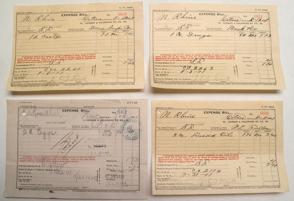 4 Expense Bills for M. Rhime at Citrus Station dated 1901, 1885 letter from Citrus to Trennor Coffin of Carson signed by F. McIver. (Ames Collection)