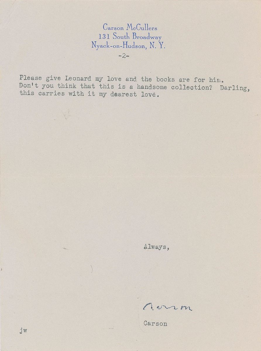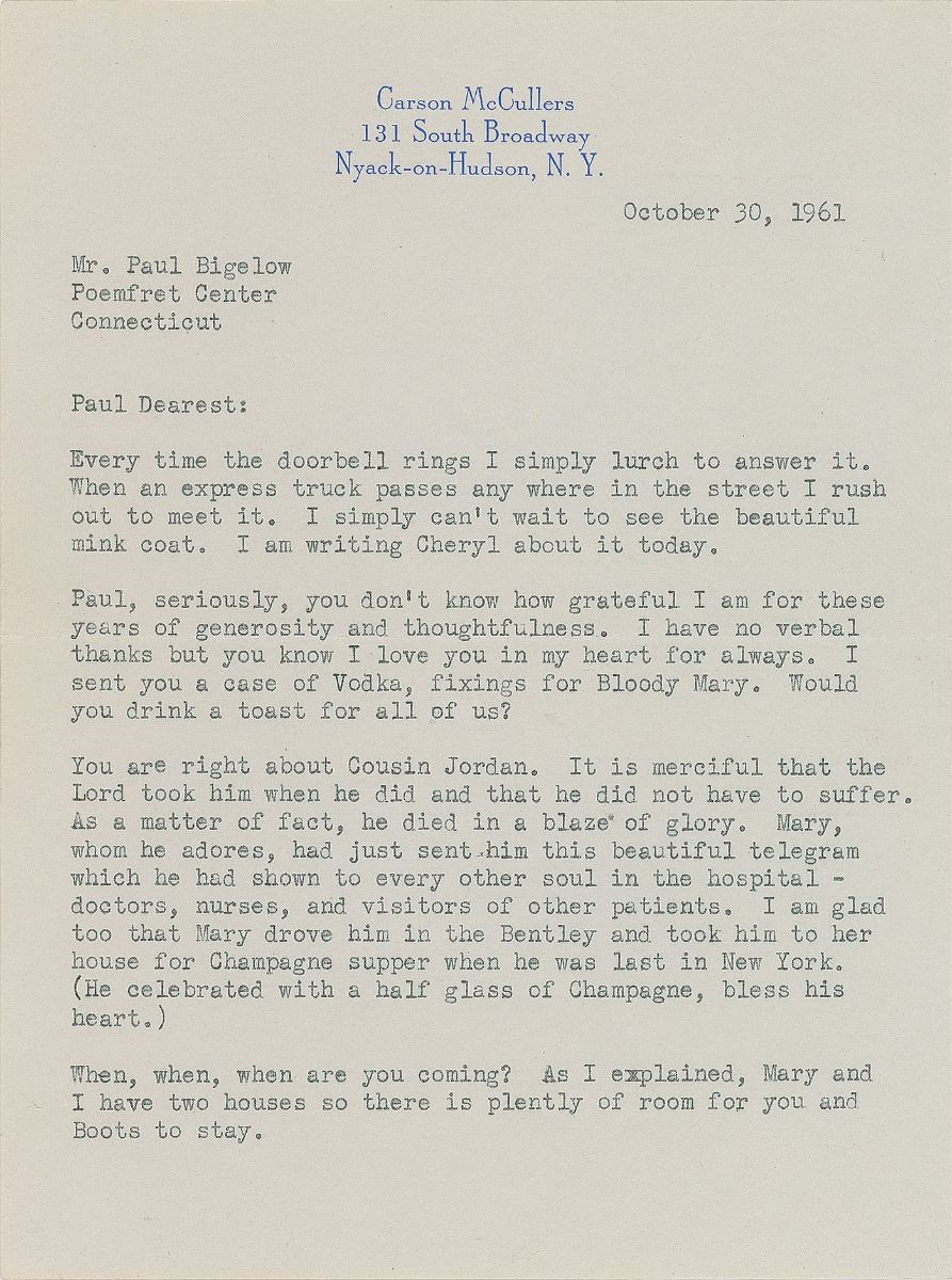 American novelist, short story writer, playwright, essayist, and poet (1917-1967) whose work is often described as Southern Gothic; she is best remembered for her first novel, The Heart Is a Lonely Hunter. Rare TLS signed “Carson,” two pages, 5.75 x 7.75, personal letterhead, October 30, 1961. Letter to Paul Bigelow of the Poemfret Center, in full: "Every time the doorbell rings I simply lurch to answer it. When an express truck passes any where in the street I rush out to meet it. I simply can't wait to see the beautiful mink coat. I am writing Cheryl about it today. Paul, seriously, you don't know how grateful I am for these years of generosity and thoughtfulness. I have no verbal thanks but you know I love you in my heart for always. I sent you a case of Vodka, fixings for Bloody Mary. Would you drink a toast for all of us? You are right about Cousin Jordan. It is merciful that the Lord took him when he did and that he did not have to suffer. As a matter of fact, he died in a blaze of glory. Mary, whom he adores, had just sent him this beautiful telegram which he had shown to every other soul in the hospital—doctors, nurses, and visitors to the other patients. I am glad too that Mary drove him in the Bentley and took him to her house for Champagne supper when he was last in New York. (He celebrated with a half glass of Champagne, bless his heart.) When, when, when are you coming? As I explained, Mary and I have two houses so there is plenty of room for you and Boots to stay. Please give Leonard my love and the books are for him. Don't you think that this is a handsome collection? Darling, this carries with it my dearest love." In fine condition. Accompanied by the original mailing envelope.
