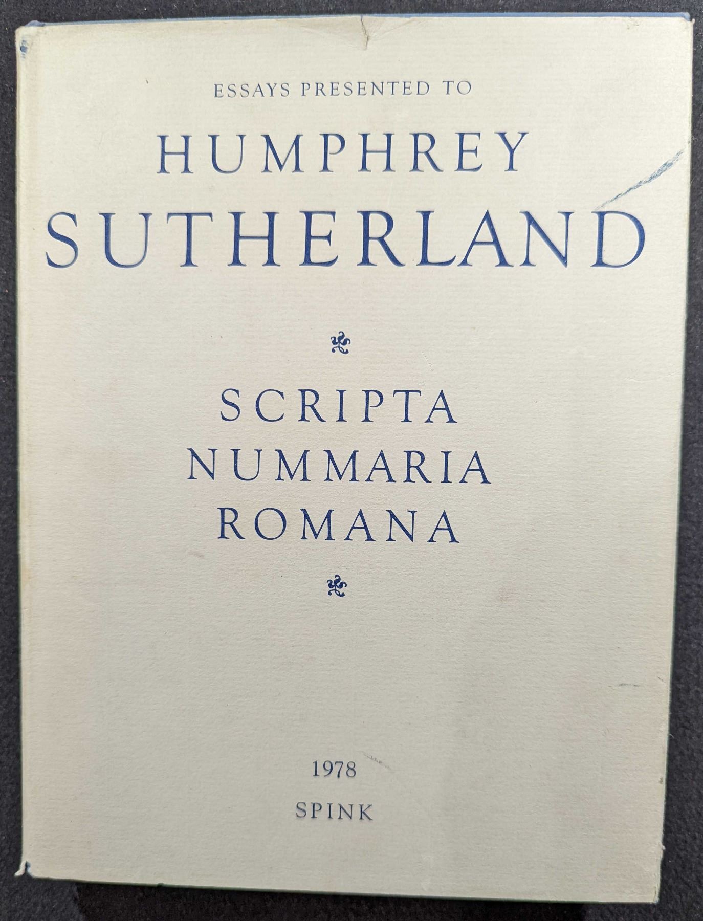 Carson, R.A.G. & Colin M. Kraay (Eds.). SCRIPTA NUMMARIA ROMANA - ESSAYS PRESENTED TO HUMPHREY SUTHERLAND. Spink & Son Ltd. 1978. 4to. 250 pages. Original blue cloth, gilt. dust jacket. Frontispiece. maps. tables. 24 plates. Very Good. Good collection of fifteen scholarly articles on Roman numismatics. Lot weight: 2 lbs 4oz. Subject(s): Coinage - Ancient Rome.