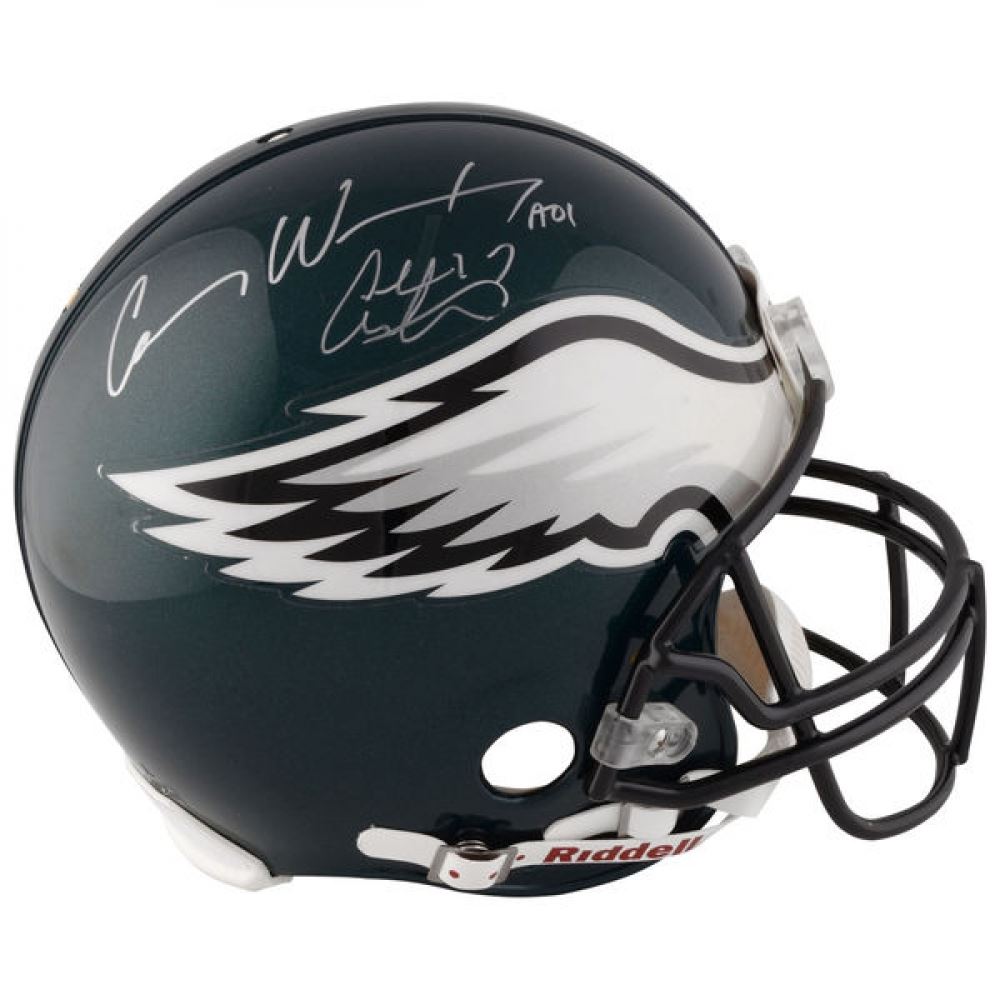 Riddell Eagles full-size authentic on-field helmet has been hand-signed in silver paint pen by Carson Wentz and Alshon Jeffery.