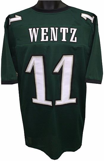 This is a new, in stock, Carson Wentz unsigned green unlicensed prostyle jersey with fully stitched twill numbers on the front and back and players name plate, there are NO LOGOS, TAGS, BRAND NAMES or PATCHES ON THIS JERSEY & IS NOT A OFFICAL LICENSED JERSEY, 100% polyester. This is perfect for autographs, to wear or as a collectible. Size XL (48/50)