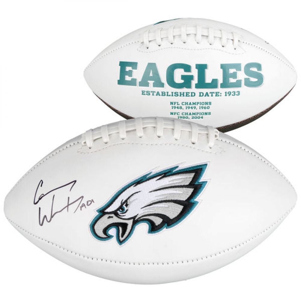 Full-size Eagles logo football. Hand-signed and inscribed in black felt tip pen by Carson Wentz.