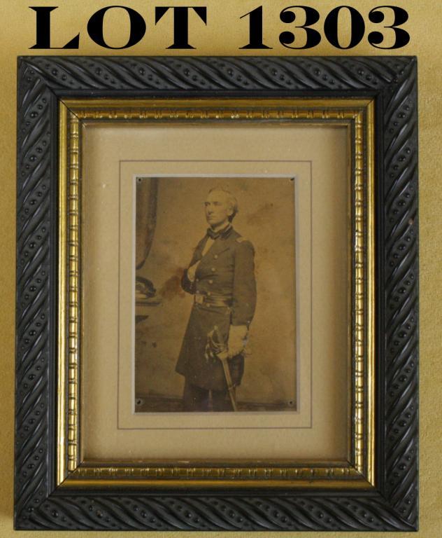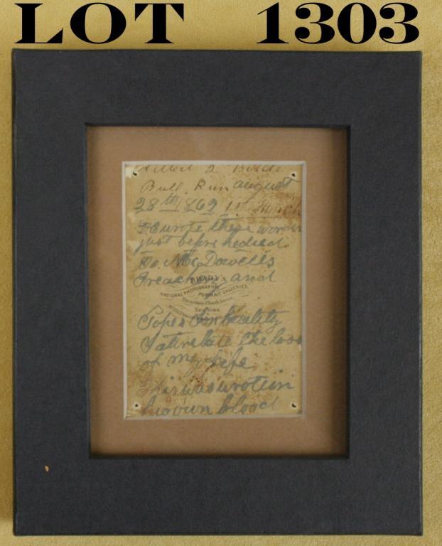 Carte Visite of Civil War officer with sword. Unidentified. Period inscribed on reverse, “Killed 2nd battle bull run August 28th 1862 1st march. He wrote these words just before he died. McDowells treachery and Pope’simbecility I attribute the loss of my life, this was written in his own blood.” Writing is in ink with what appears to be blood stains. Brady Gallery stamped. Est: $200 - $400