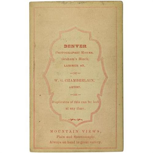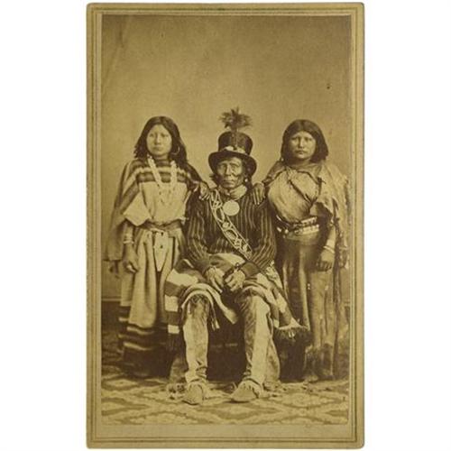 <B>Carte de Visite - Studio portrait of Ute Chief Curecanti and two Women</B></I><BR>Circa 1865<BR>Length 4 in. Width 2 1/2 in.<BR><BR>The seated man is wearing a bandolier bag decorated with floral designs of a style commonly associated with Cree and Metis people. His leggings and moccasins are typically Ute. The woman on the left is wearing a cloth dress with a beaded tab bag tied to her belt. The woman on the right is wearing a hide dress and a leather belt decorated with large metal studs. Photograph by W.G. Chamberlin, Denver, Colorado with his studio imprint on the reverse.<BR><BR>