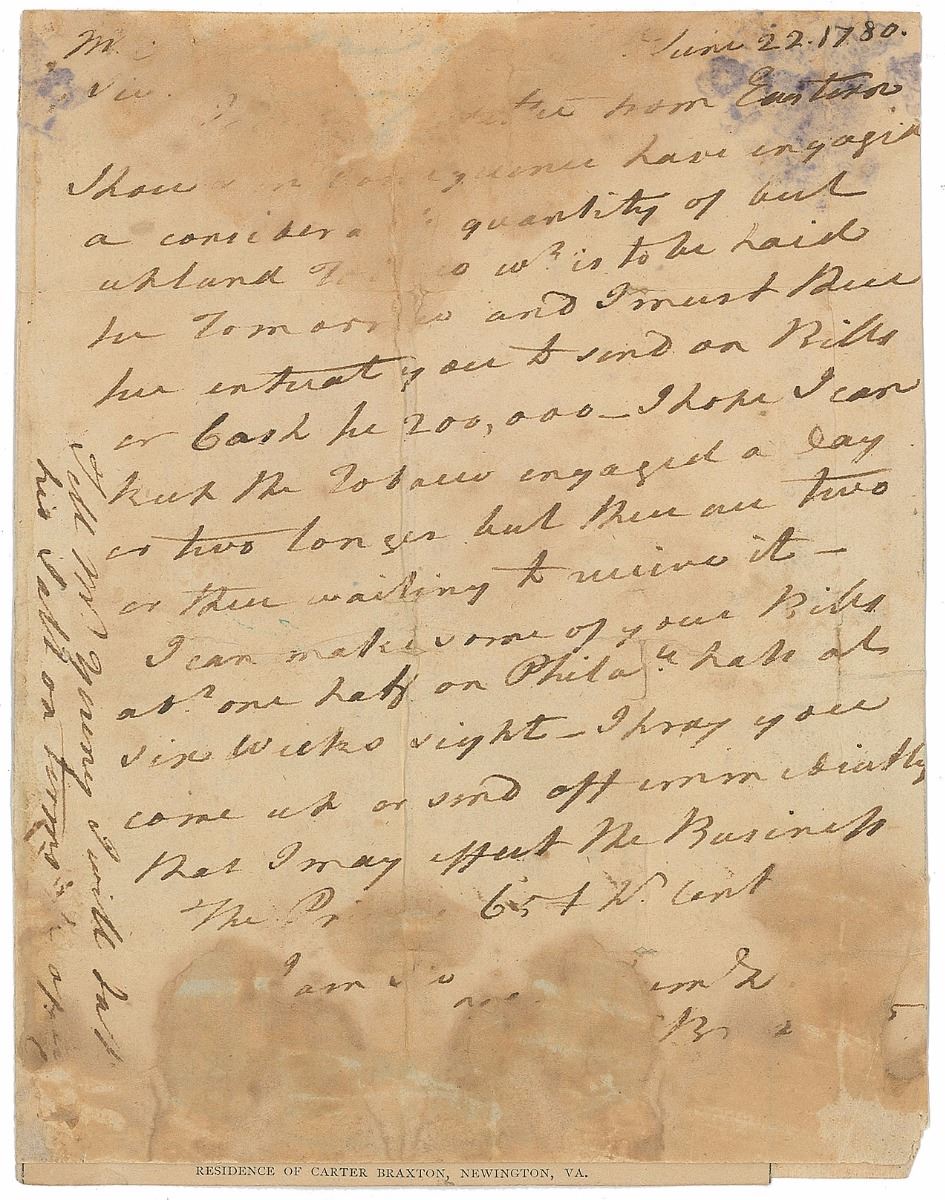 Signer of the Declaration of Independence from Virginia (1736–1797) who was one of the wealthiest and most powerful plantation owners in the colony. Rare Revolutionary War–dated ALS signed “Br[a]x[ton],” one page, 5.75 x 7.5, June 22, 1780. Letter to John Taylor regarding business matters and tobacco planting. In part: “I hope I can keep the Tobacco engaged a day or two longer but there are two or three waiting to receive it—I can make some of your Bills asn. one half on Phila. hall at six weeks sight. I pray you come up or send off immediately that I may effect the Business.” Affixed to a same-size sheet for restoration and reinforcement. Retains the original address panel in Braxton’s hand affixed to the second integral page. Newspaper clippings and a printed facsimile autograph are affixed inside. Restored to good condition, with large areas of restored paper loss to top and bottom (including to most of the signature area), heavy overall dampstaining affecting portions of the writing and signature, and general soiling.
