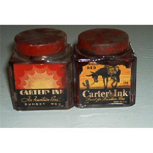 Featuring two different Carter's Ink Bottles. Red tin lids. One has a donkey pictured on the front-#176; finest for fountain pens; 2 oz.; made in the USA. Bottom has the #15-RED; The second bottle also states Carter's Ink;For Fountain Pens; SUNSET RED; #176; Bottom of bottle has the #5 Red; 176. Both in excellent condition.