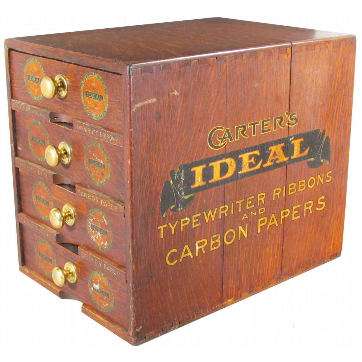 Carter's "Ideal" Typewriter Ribbon & Carbon Paper Four Drawer Display Cabinet. Oak cabinet with original decals. Some minor vertical crack in wood and wear to decals otherwise very good condition. 10 1/4 X 12 1/2 X 15 inches.