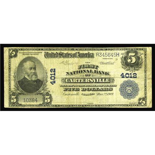 <B>Cartersville, GA</B></I> - $5 1902 Plain Back Fr. 600 <B>The First NB</B></I> Ch. # 4012<BR>While easily available in small size, notes from this bank are just plain scarce in large, the Kelly census figure of eight notwithstanding. This <B>Fine</B></I> example will be a welcome addition to any Georgia collection.