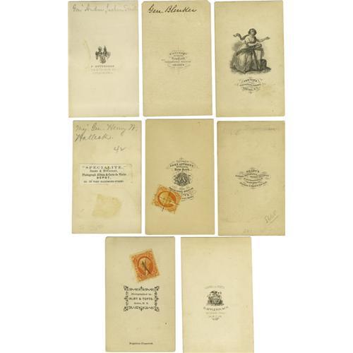 <B><I>Cartes de Visite</B></I></B></I><B> of Eight Union Generals.</B></I> A very nice lot of scarce images, consisting of Willoughby Babcock (Almy & Tufts, Sodus, New York), Halleck (Appleton & Co., New York), Burnside (Anthony), Halleck (Selby & McCauley, Baltimore Street), Frank Blair (Brady), Andrew Jackson Smith (Gutekunst, Philadelphia), Blenker (Anthony / Brady), & Colonel Berdan (Porter's, Oneida, New York). Overall excellent condition.<BR><BR><b>Shipping:</b> Small Flat (<a target="_blank" href="http://www.heritageauctions.com/common/shipping.php">view shipping information</a>)