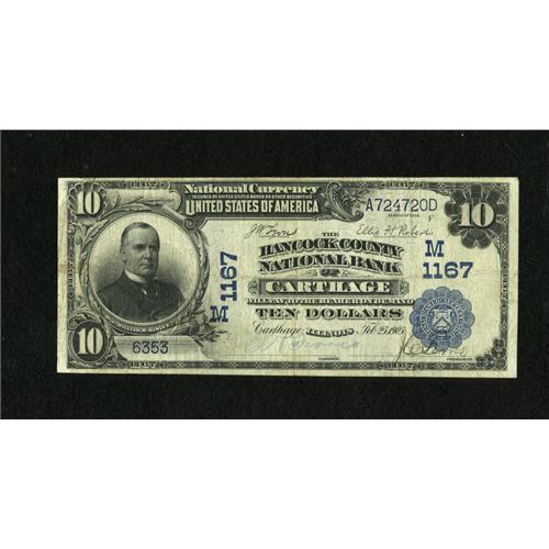 <B>Carthage, IL</B></I> - $10 1902 Plain Back Fr. 624 <B>The Hancock County NB</B></I> Ch. # (M)1167<BR>Both signatures are present, though one is a little weak. The printed details are especially bold. <B>Fine.</B></I><BR><I>From The Lincoln Collection</B></I><BR><BR><b>Shipping:</b> Coins & Currency (<a target="_blank" href="http://www.heritageauctions.com/common/shipping.php">view shipping information</a>)