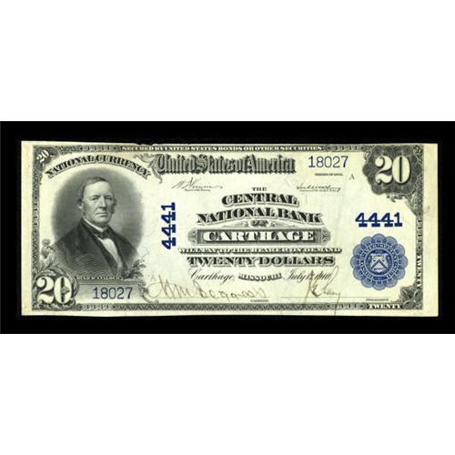 <B>Carthage, MO</B></I> - $20 1902 Plain Back Fr. 653 <B>The Central NB</B></I> Ch. # 4441<BR> An exceptionally high grade example with bright colors and sharp pen signatures. <B>About Uncirculated.</B></I><BR><I>From The Warren Marshall Collection</B></I><BR><BR><b>Shipping:</b> Coins & Currency (<a target="_blank" href="http://www.heritageauctions.com/common/shipping.php">view shipping information</a>)