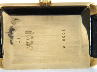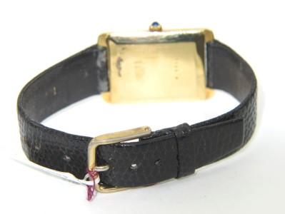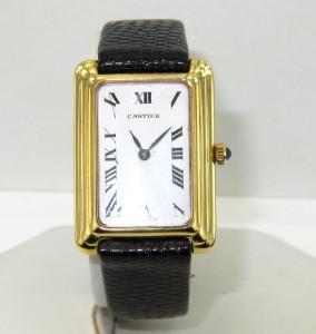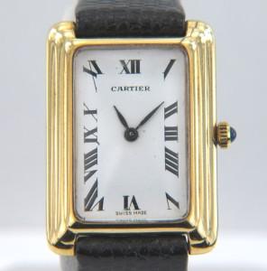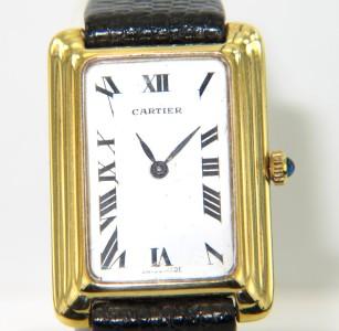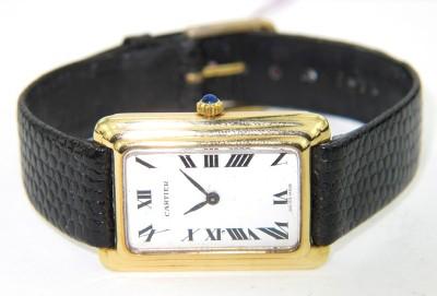 Cartier 18K Yellow Gold Leather Strap Watch.The total watch's weight is 26.5 grams.The measurement of watch head is 25 x 29 mm and 6 mm thick.The length of watch: 7.5".Leather Strap is 16 mm wide.water Resistant.swiss made