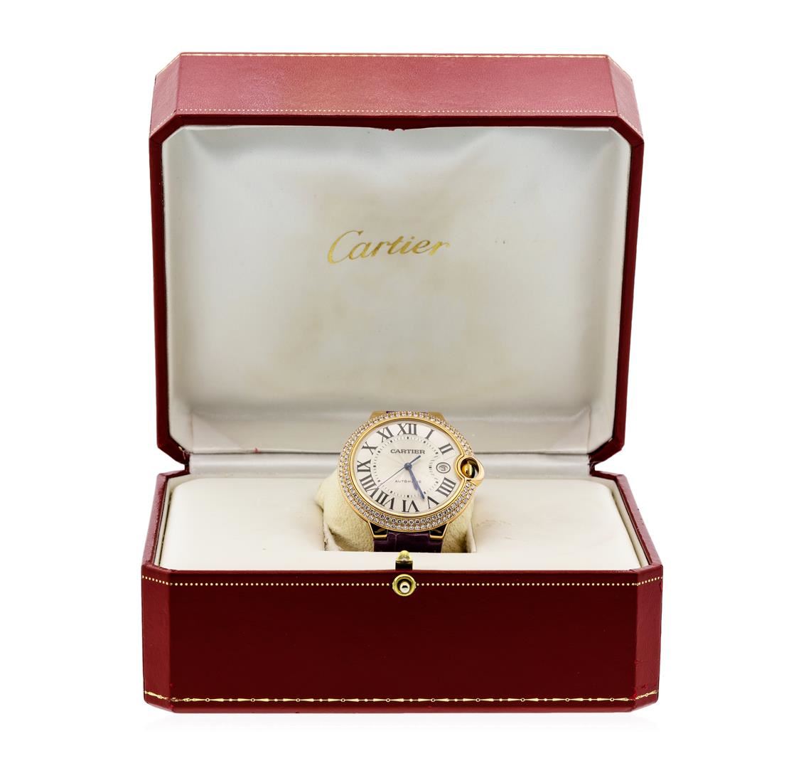 One, Ballon Bleu de Cartier wristwatch electronically tested 18KT rose gold, Case: 42mm diameter, Water Resistant: 30 meters / 100 feet, Swiss & Cartier Hallmarked Case Back: Convex, secured by eight inset screws, Fluted Crown: set with a blue cabochon crystal, within a protective casing, Custom Bezel: two tiered diamond set, Crystal: anti-reflective domed synthetic sapphire.Movement: automatic, Dial: Silvered, with sword shaped Blue steel hands & Roman numerals, central circular minute track with bolded five minute intervals, Date Window: 3 o'clock position, AVG Bracelet: Purple color saddle stitched leather strap, Condition: G-5 Fine. Seven inch length, adjustable. 18KT gold Swiss & Cartier Hallmarked concealed deployment clasp. Containing:Numerous pave� & prong set round brilliant cut diamonds, approximate total weight = 2.00ct. Set & graded in the bezel. Clarity: VVS-2 Color E - F. Total Weight of Diamonds 2.00ct. Total Weight of Watch 108.57gm. AIG Appraised at $44,000.00.