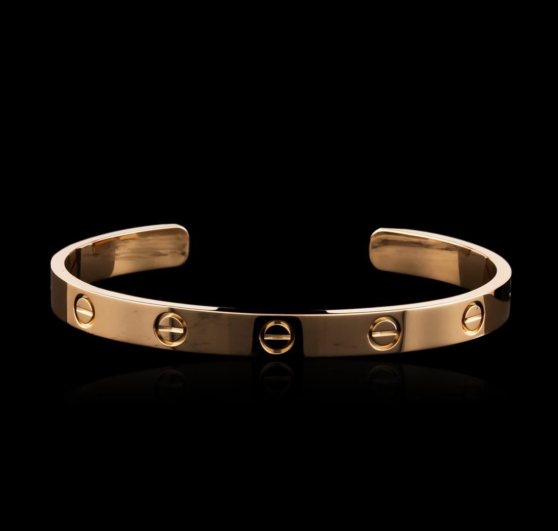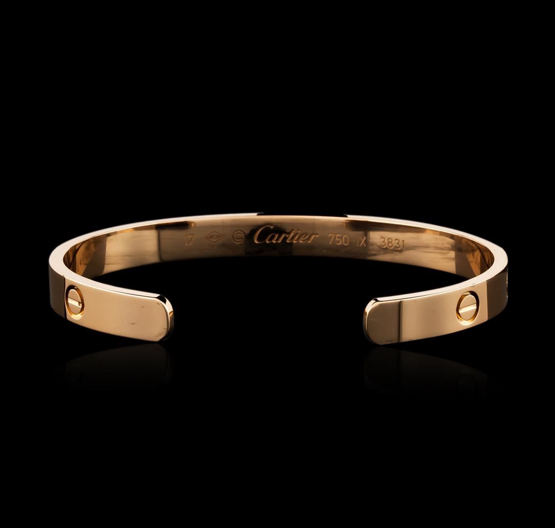 One electronically tested 18KT rose gold ladies cast cuff bracelet with a bright polish finish. The open cuff bracelet is from Cartier's LOVE Collection. The cuff bracelet is a size 17. Trademark is Cartier. Identified with markings of "750". Condition is good. Total Weight of Cuff Bracelet 22.58 grams. AIG Appraised at $4,500.00.