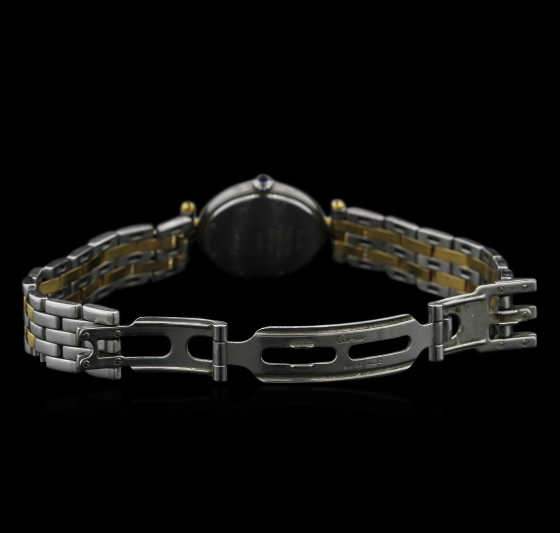 Cartier Panthere Vendome date ladies watch. The watch has an 18KT yellow gold bezel and 18KT yellow gold links on the band. White dial. Stainless steel 29mm case. 18KT yellow gold and stainless steel 6 inch band. Stainless steel hidden folding clasp. Sapphire crystal glass. Quartz: Battery movement.