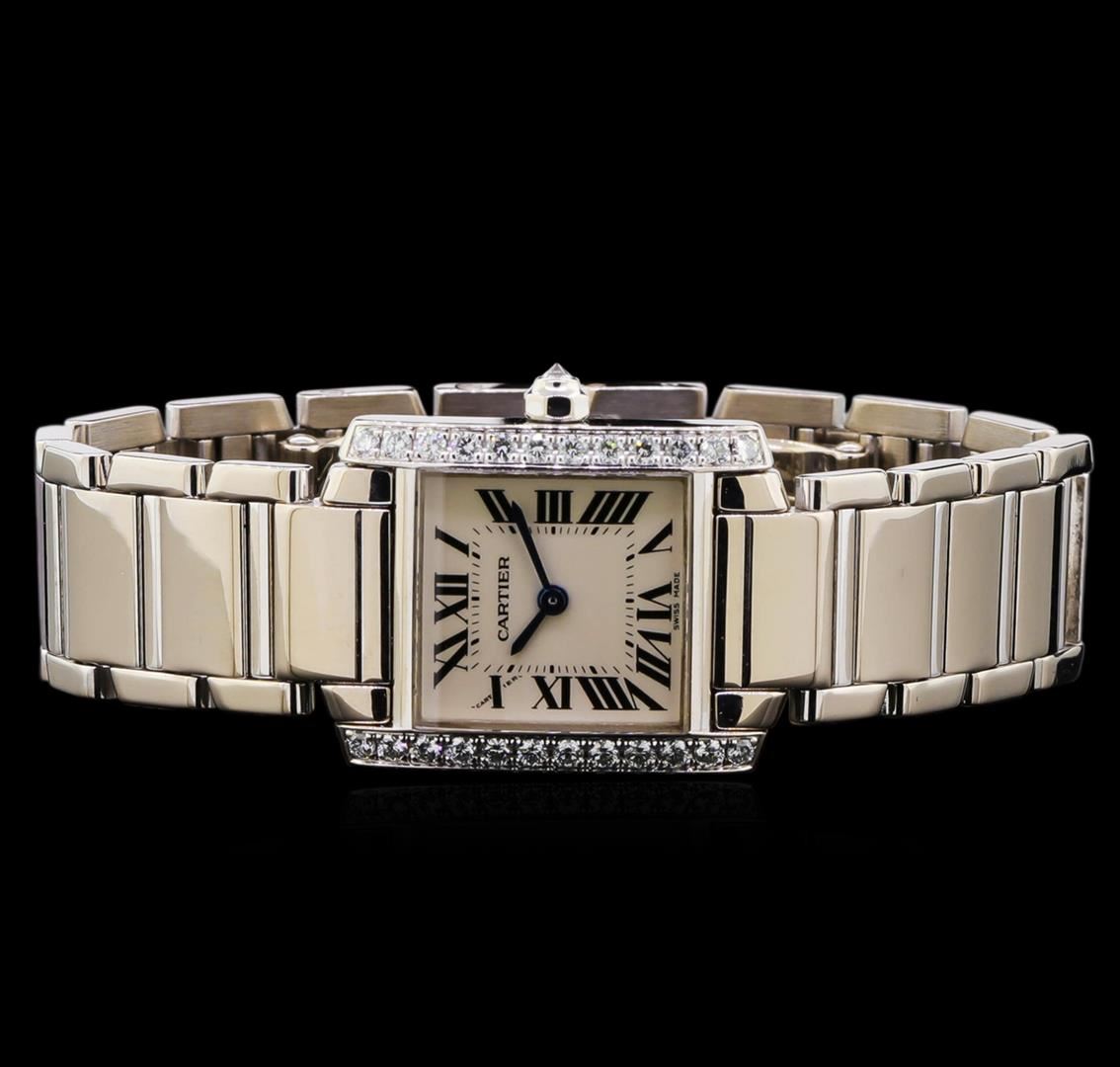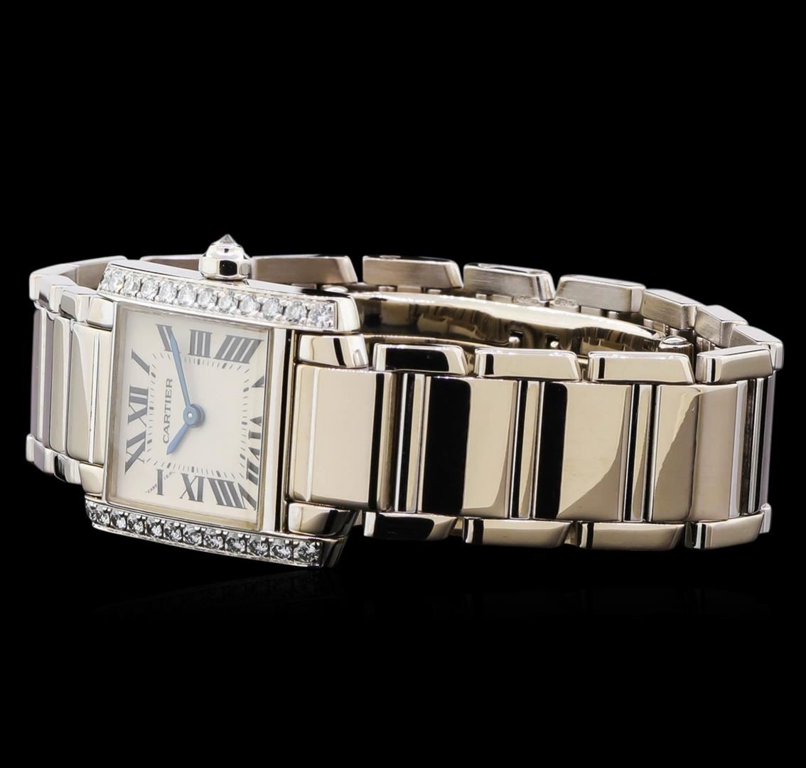 One Cartier watch featuring: Case: rounded rectangle, 25mm x 20mm, 18KT white gold, diamond set edges. Dial: White with black Roman numerals, blue pointed hands. Movement: Automatic. Crystal: Sapphire. Crown: diamond set. Bracelet: 18KT white gold with 18KT white gold deployment clasp. Condition: Very minor wear on bracelet, overall near perfect condition.