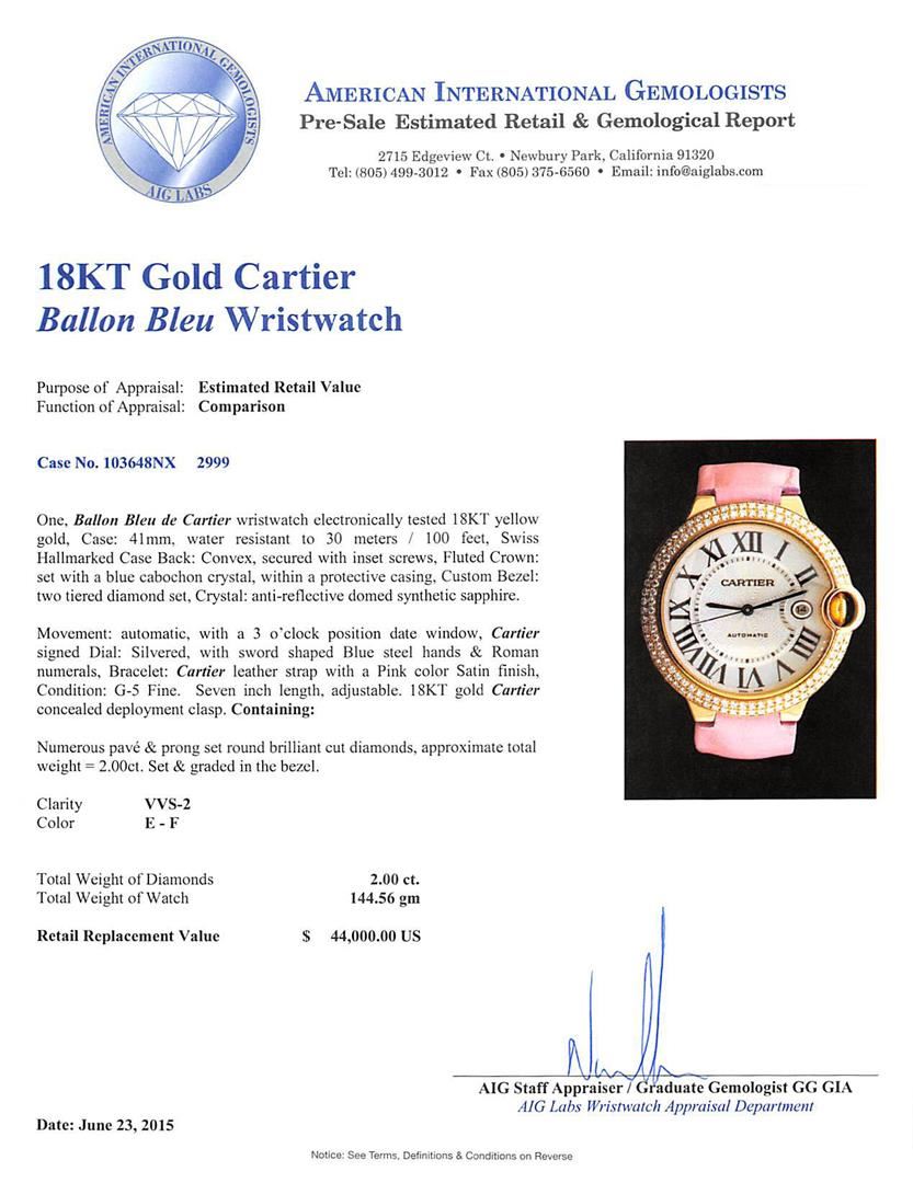 One, Ballon Bleu de Cartier wristwatch electronically tested 18KT yellow gold, Case: 41mm, water resistant to 30 meters/100 feet, Swiss Hallmarked Case Back: Convex, secured with inset screws, Fluted Crown: set with a blue cabochon crystal, within a protective casing, Custom Bezel: two tiered diamond set, Crystal: anti-reflective domed synthetic sapphire. Movement: automatic, with a 3 o'clock position date window, Dial: Silvered, with sword shaped Blued steel hands & Roman numerals, Cartier Bracelet: leather strap with a Pink color satin finish; seven inch length, adjustable. Condition: G-5 Fine. 18KT gold Cartier concealed deployment clasp. Containing: Numerous pave & prong set round brilliant cut diamonds, approximate total weight = 2.00ct. Set & graded in the bezel. Clarity: VVS-2. Color: E-F. Total Weight of Watch: 144.56 grams. AIG Appraised at $44,000.00.