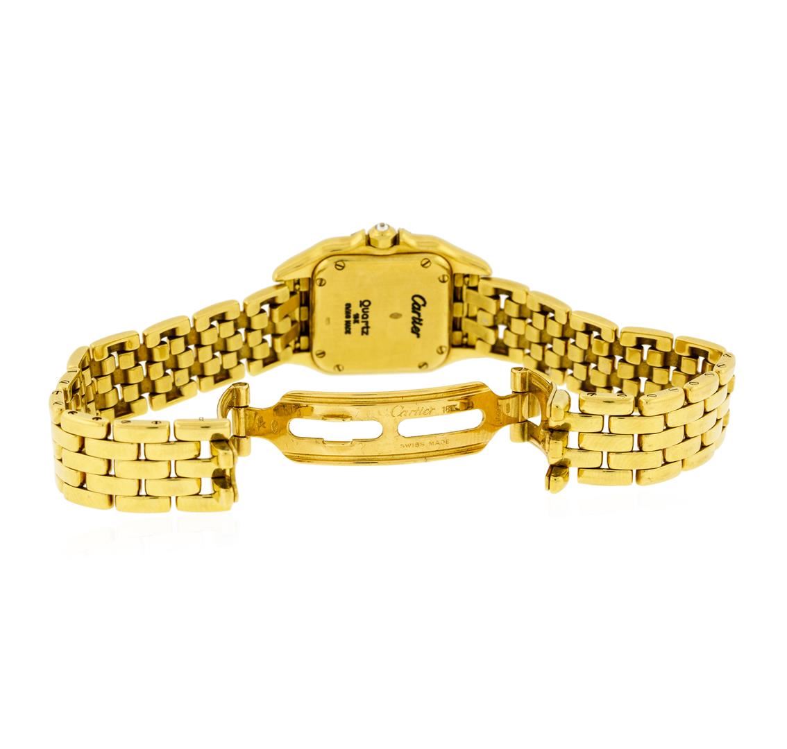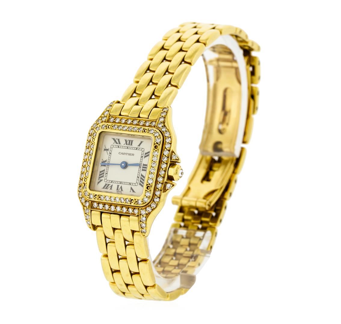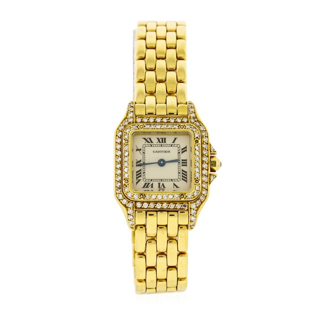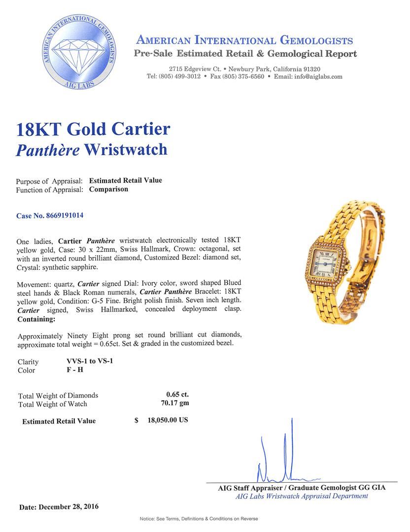 One ladies, Cartier Panthere wristwatch electronically tested 18KT yellow gold, Case: 30 x 22mm, Swiss Hallmark, Crown: octagonal, set with an inverted round brilliant diamond, Customized Bezel: diamond set, Crystal: synthetic sapphire. Movement: quartz, Cartier signed Dial: Ivory color, sword shaped Blued steel hands & Black Roman numerals, Cartier Panthere Bracelet: 18KT yellow gold, Condition: G-5 Fine. Bright polish finish. Seven inch length. Cartier signed, Swiss Hallmarked, concealed deployment clasp. Containing: Approximately Ninety Eight prong set round brilliant cut diamonds, approximate total weight = 0.65ct. Set & graded in the customized bezel. Clarity: VVS-1 to VS-1 Color F - H. Total Weight of Diamonds 0.65ct. Total Weight of Watch 70.17gm. AIG Appraised at $18,050.00.