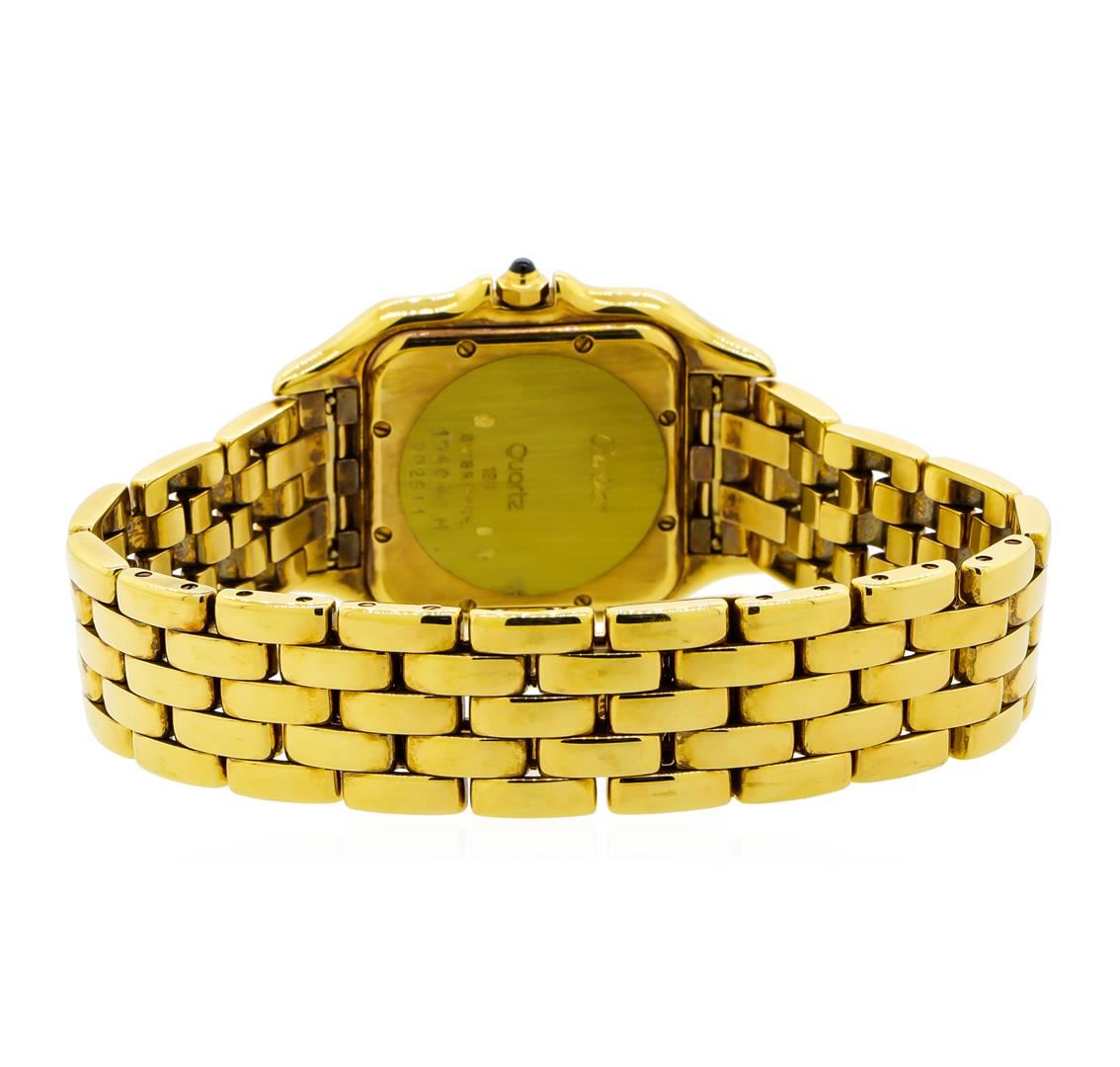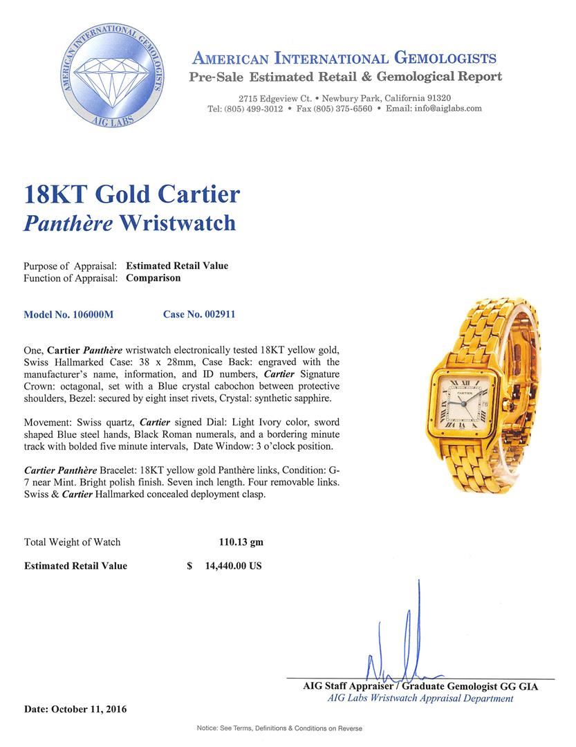 One, Cartier Panthere wristwatch electronically tested 18KT yellow gold, Swiss Hallmarked Case: 38 x 28mm, Case Back: engraved with the manufacturer's name, information, and ID numbers, Cartier Signature Crown: octagonal, set with a Blue crystal cabochon between protective shoulders, Bezel: secured by eight inset rivets, Crystal: synthetic sapphire. Movement: Swiss quartz, Cartier signed Dial: Light Ivory color, sword shaped Blue steel hands, Black Roman numerals, and a bordering minute track with bolded five minute intervals, Date Window: 3 o'clock position. Cartier Panthere Bracelet: 18KT yellow gold Panthere links, Condition: G-7 near Mint. Bright polish finish. Seven inch length. Four removable links. Swiss & Cartier Hallmarked concealed deployment clasp. Total Weight of Watch 110.13gm. AIG Appraised at $14,440.00.