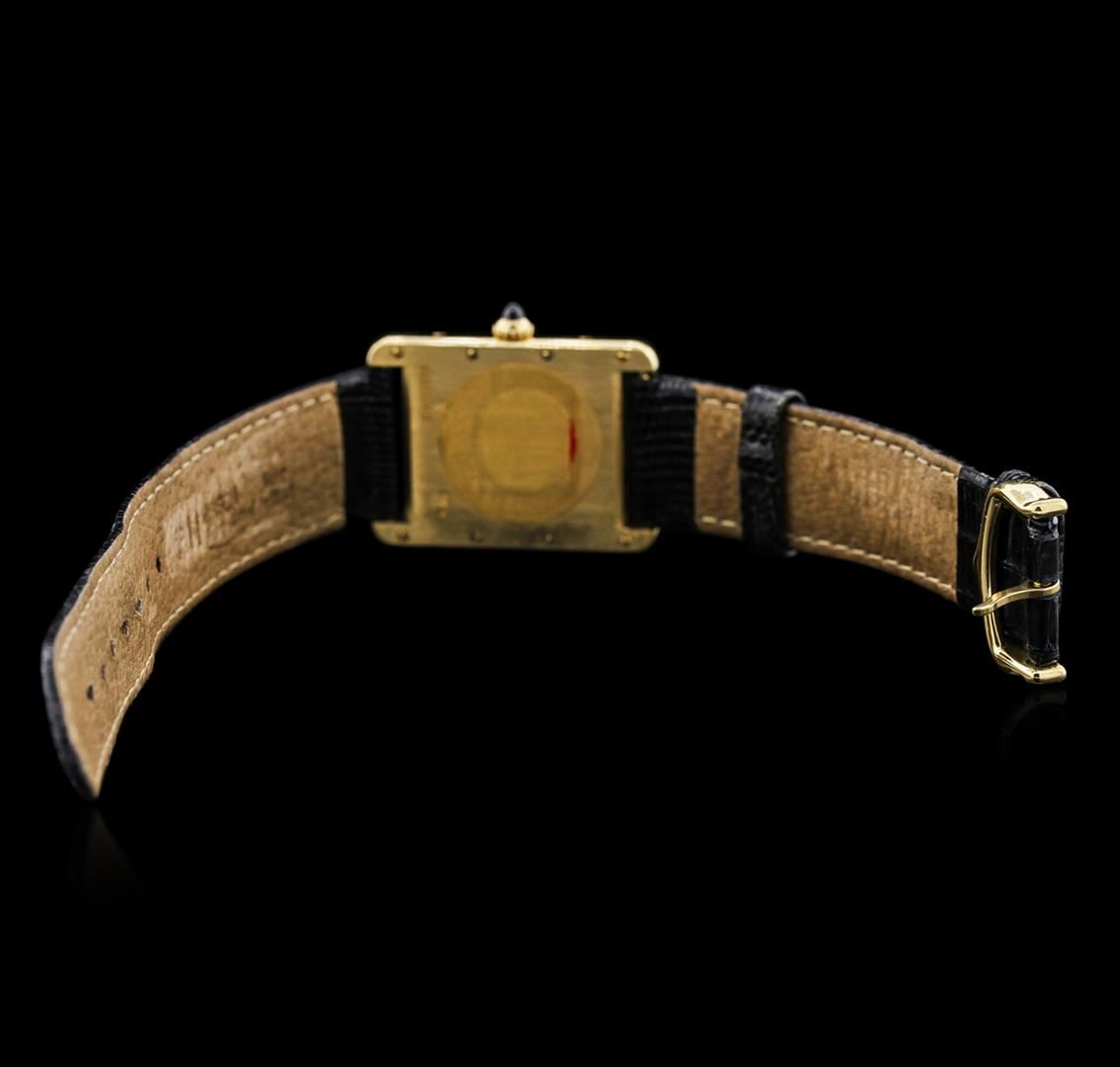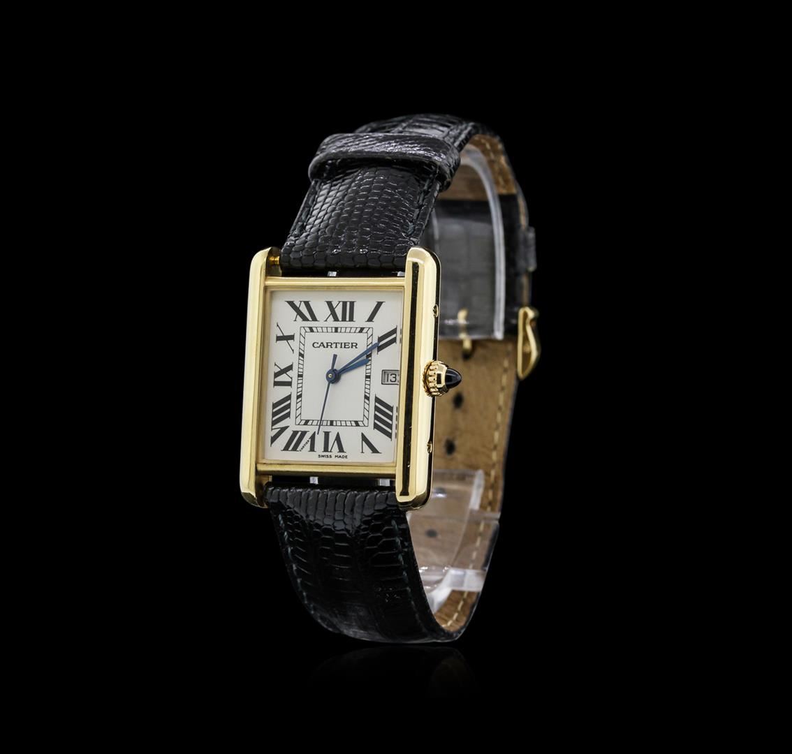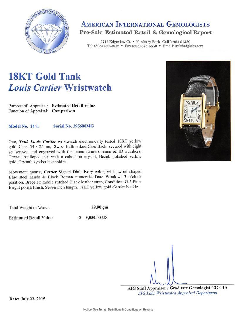 One, Tank Louis Cartier wristwatch electronically tested 18KT yellow gold, Case: 34 x 25mm, Swiss Hallmarked Case Back: secured with eight set screws, and engraved with the manufacturers name & ID numbers, Crown: scalloped, set with a cabochon crystal, Bezel: polished yellow gold, Crystal: synthetic sapphire. Movement quartz, Cartier Signed Dial: Ivory color, with sword shaped Blue steel hands & Black Roman numerals, Date Window: 3 o'clock position, Bracelet: saddle stitched Black leather strap, Condition: G-5 Fine. Bright polish finish. Seven inch length. 18KT yellow gold Cartier buckle. Total Weight of Watch: 38.90 grams. AIG Appraised at $9,050.00.