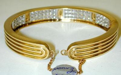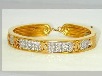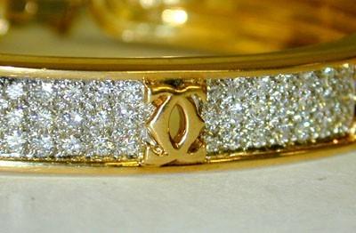 Cartier 18K Two-Tone Gold Diamond Bangle. Bangle's Weight: 38.7 grams. The total Weight of Diamonds is 4cts, approximately, G color, VS clarity. The inside measurements of the Bangle are 74 x45 mm and the thickness is 4 mm.