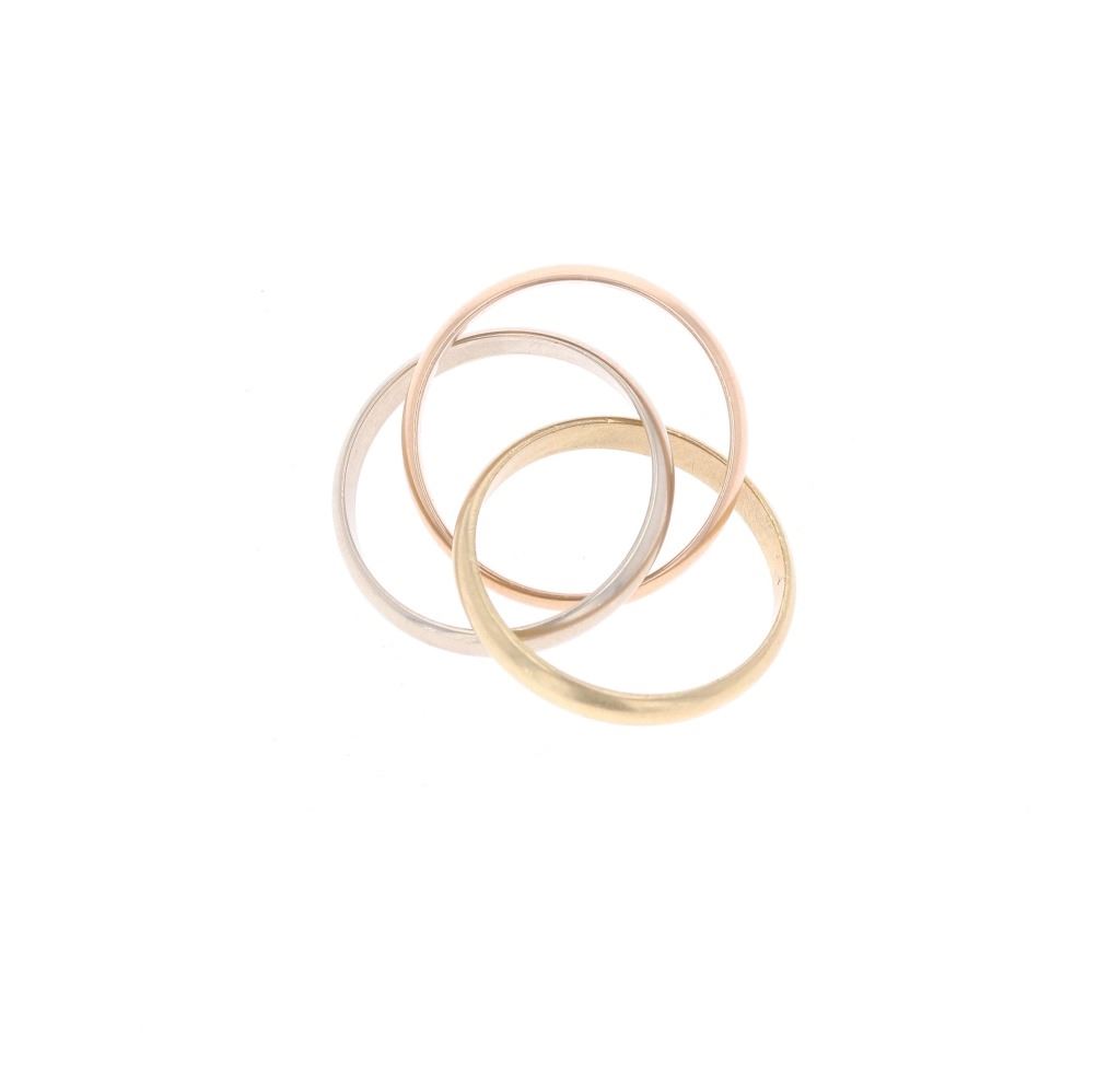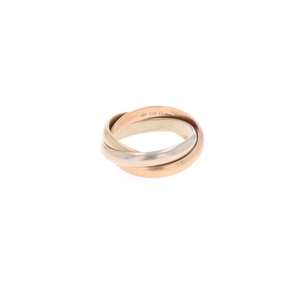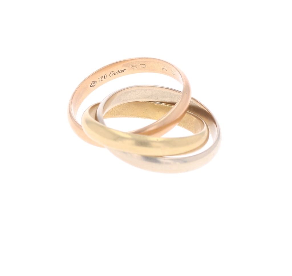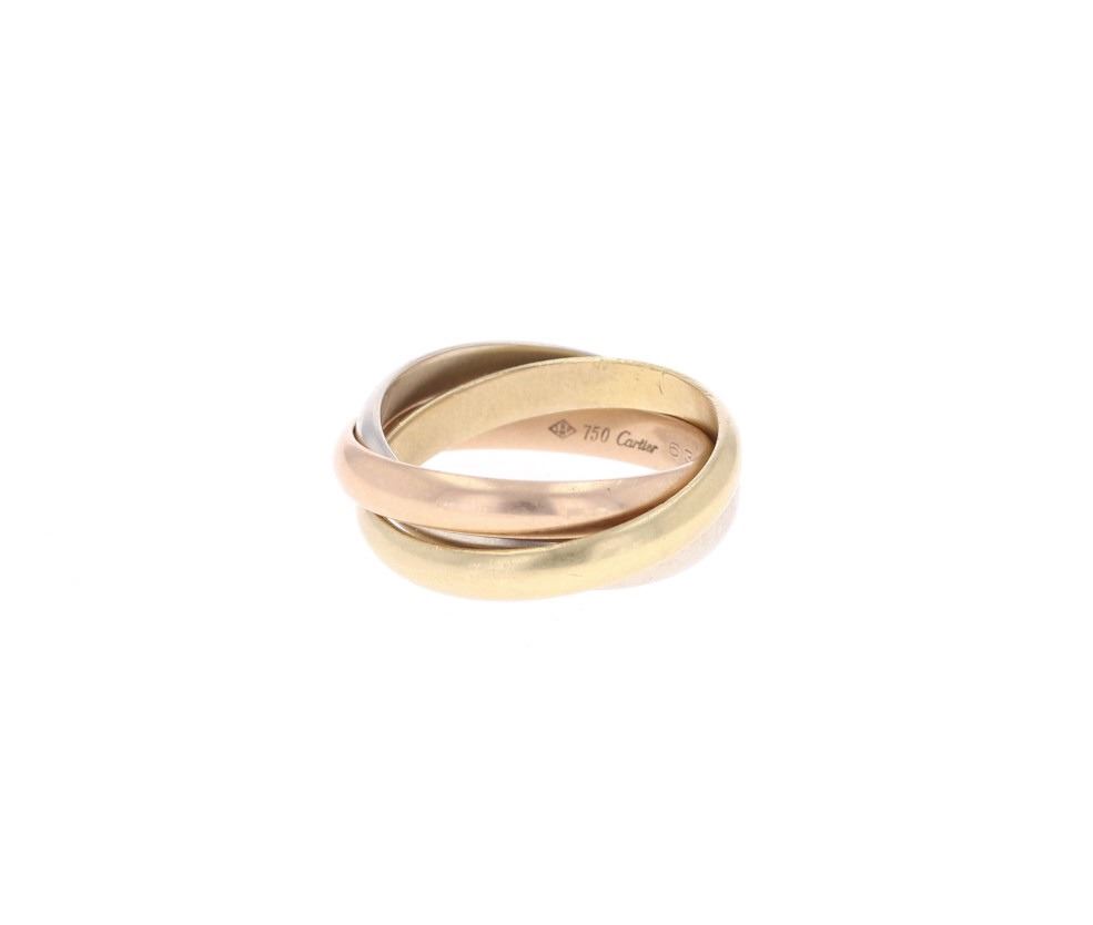 Featured in this lot is this authentic, Cartier 18k tri color gold "Trinity" triple ring. The ring features a wonderfully and professionally crafted 18k gold construction that shows three colors: Yellow, Rose, and White gold. The ring is of the rolling "Trinity" design for how they roll onto and off your finger. The rings are marked as follows: 750 (18k) - Cartier - 63Kg - 0430. The condition of this Cartier ring is good with no obvious signs of damage and shows a good overall condition. The overall measurements of this ring is 1 1/8" x 1" and the ring size is US 9 1/4. The collective weight of this ring is 10.9g. Provenance: From a prominent ex-Bozeman private collection who purchased the majority of his collection from Cowan's, Skinner, Bonhams, Morphy's, Sotheby's, March in Montana, North American Auction and other well revered auction houses.
