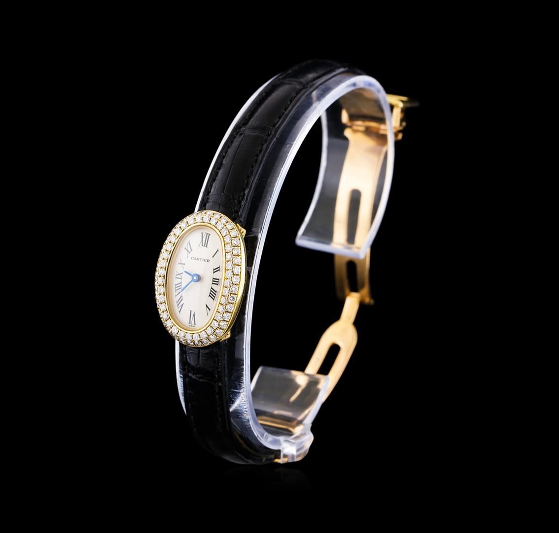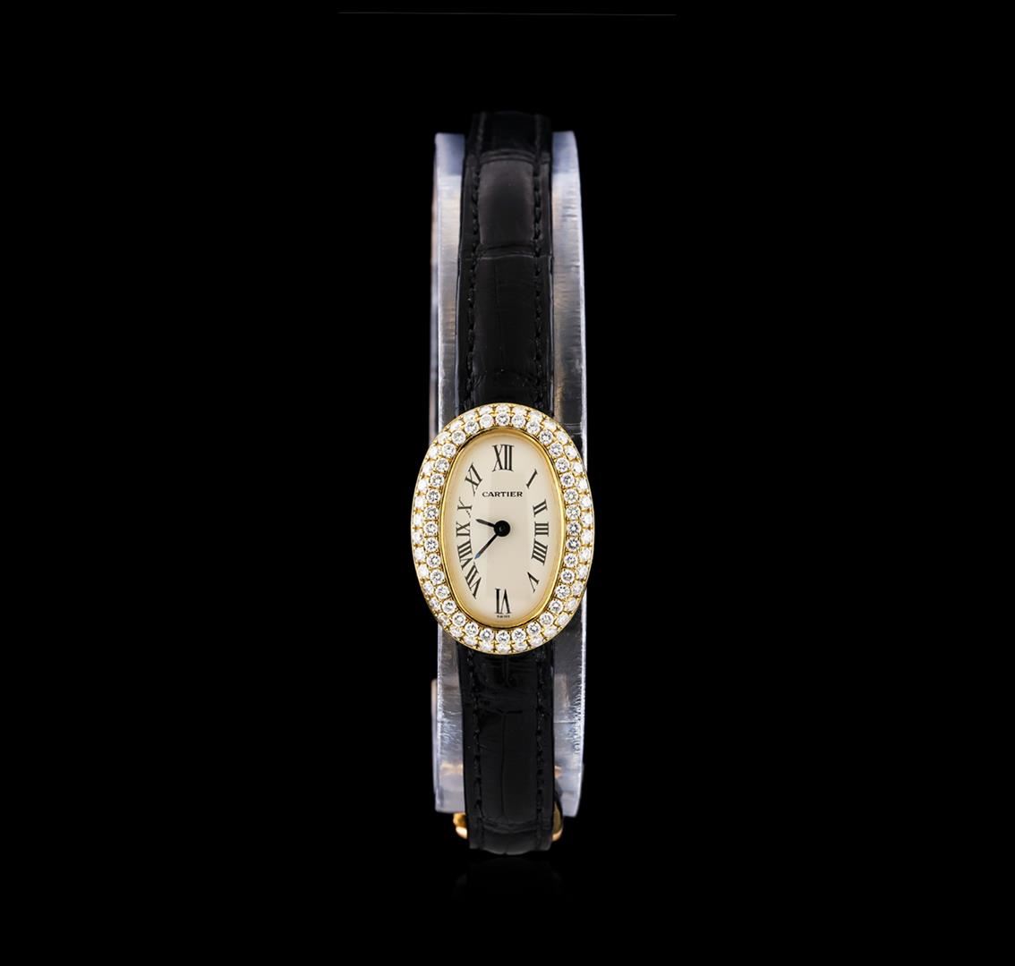 One Cartier Baignoir Mini lady's watch featuring: Case: Oval 25mm x 18mm 18KT yellow gold. Dial: Silver with pointed baton-type hands and black roman numerals. Bezel: 18KT yellow gold set with diamonds. Bracelet: black leather with 18KT yellow gold deployment buckle. Movement: Quartz. Condition: light wear on case and bracelet but otherwise great condition.