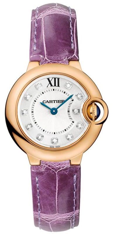 Model: WE902050 - CASE = [Material:18kt Rose Gold], [Case Diameter:28], [Case Thickness:9.35mm], [Case Back:Solid], [Water Resistant:30 Meters - 100 Feet], [Crystal:Scratch Resistant Sapphire], DIAL = [Color:Silver Opaline with Diamond Hour Markers], MOVEMENT = [Type:Calibre 057 Battery Powered Quartz], [Crown:18K Rose Gold Set With Blue Sapphire], BAND = [Clasp:Tang Buckle], [Type:Purple Alligator], (Usually ships in 1 to 2 weeks.)