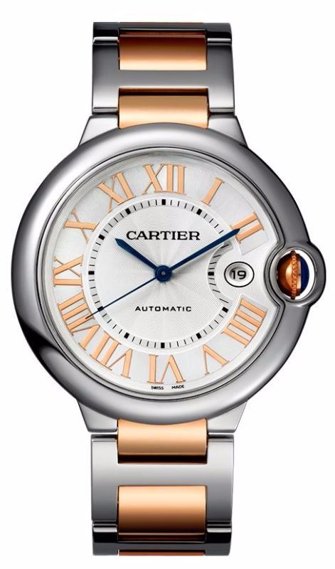 Model: W6920095 - CASE = [Material:Polished Stainless Steel], [Case Diameter:42], [Case Thickness:13mm], [Case Back:Solid], [Water Resistant:30 Meters - 100 Feet], [Crystal:Scratch Resistant Sapphire],; DIAL = [Color:Silver],; MOVEMENT = [Type:Automatic Self Winding Cartier Calibre 049], [Crown:18KT Rose Gold set with Synthetic Blue Cabochon],; BAND = [Clasp:Hidden Folding Clasp], [Type:Polished 18KT Rose Gold and Stainless Steel (the first 3 links on each side are gold, the remainder are stainless steel)], (Usually ships in 1 to 2 business days.)