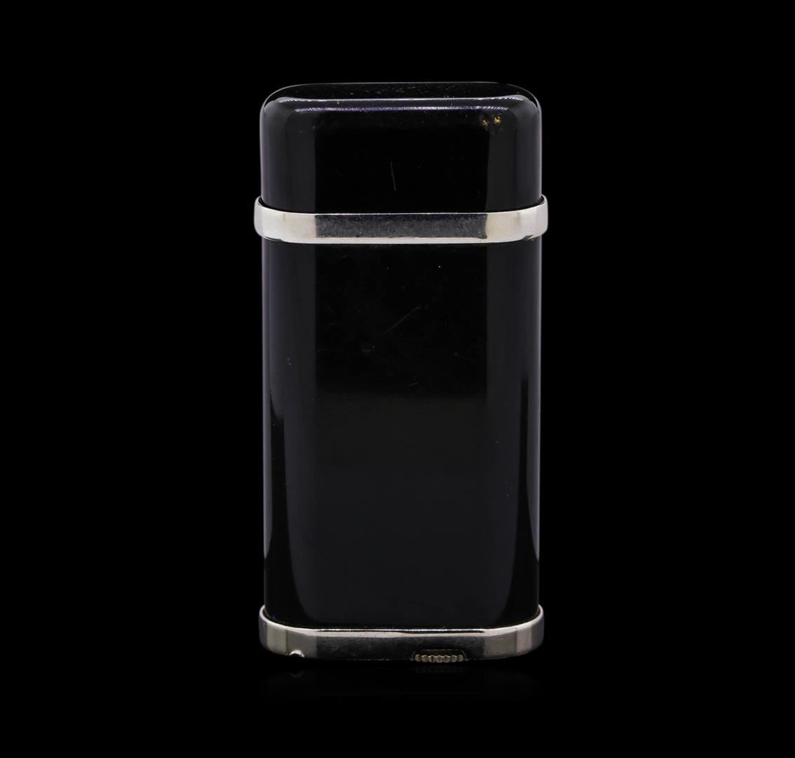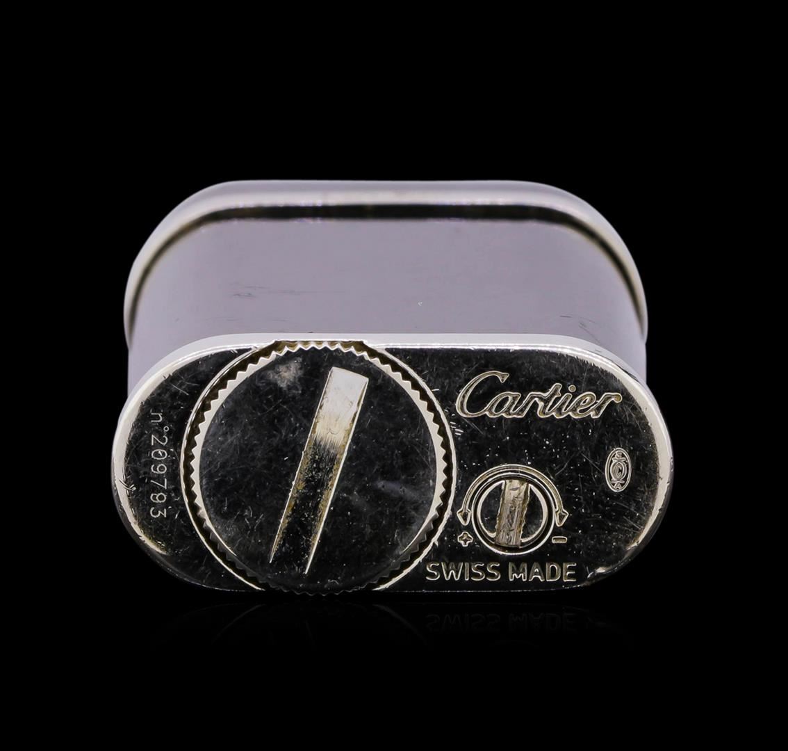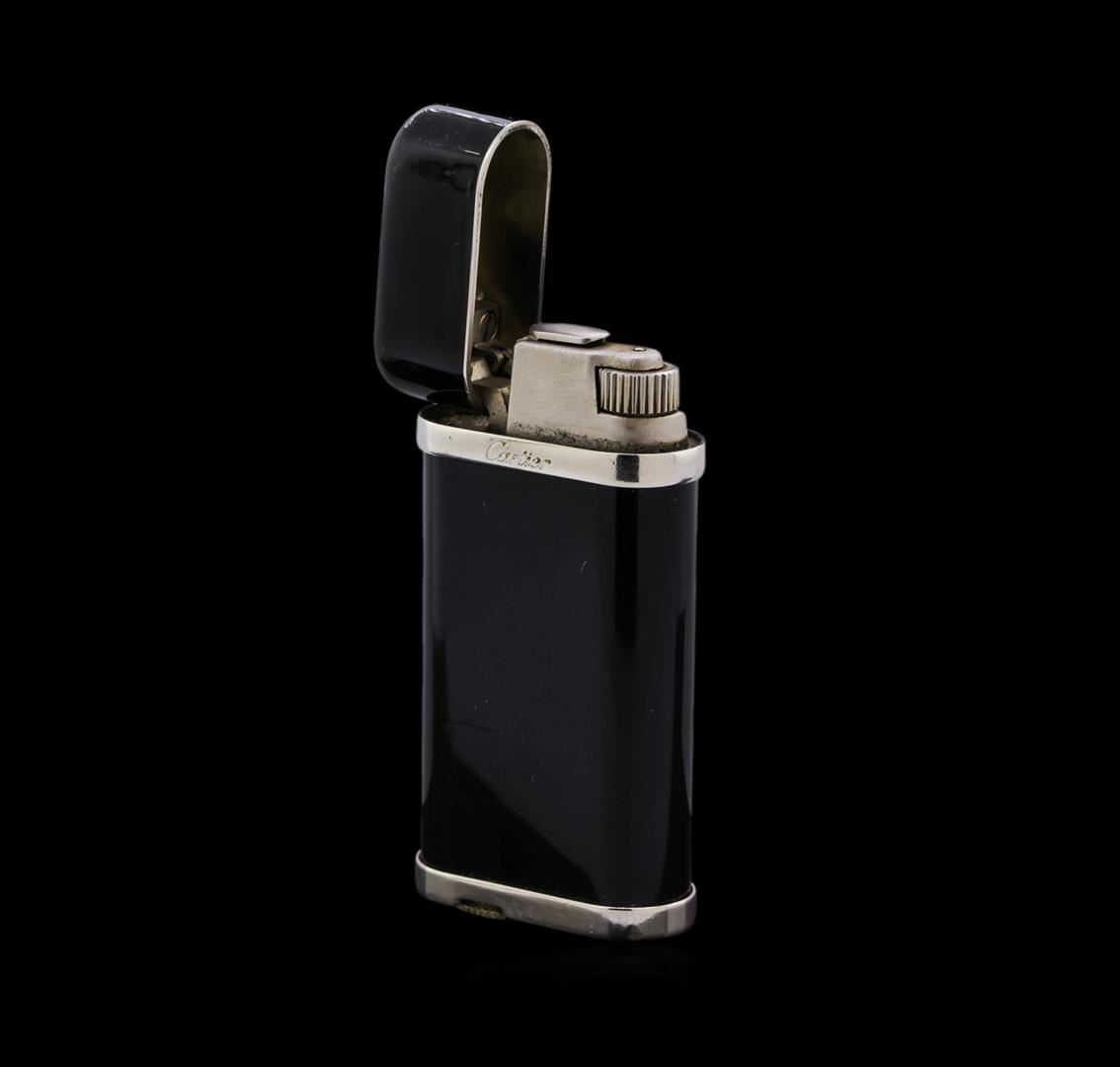 One Cartier lighter featuring: Black composite body, black cap, and palladium finish detail. Stamped Cartier and SWISS MADE. Dimensions: Height 60 mm x Width 29 mm.