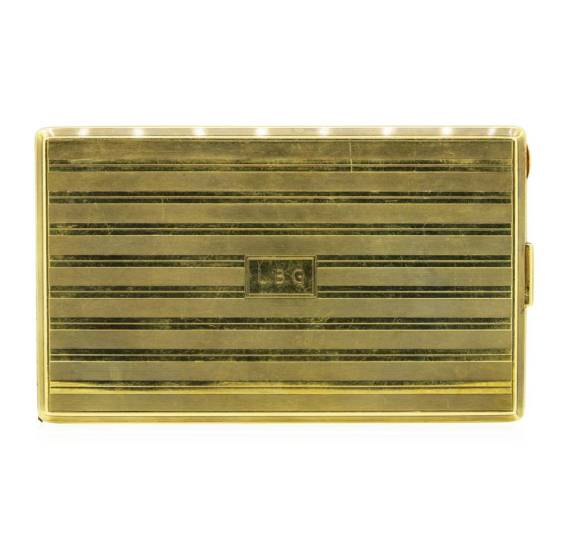 One electronically tested 14KT yellow gold combination cast & assembled vintage cigarette case with a bright polish and satin finish. The featured cigarette case is engraved with the initials 'LBG' on the front and reads on the inside: L.B. Gillchrest1885 - 1928A token of forty three years of faithful service toW.R. Grace & Co.With the affectionate regards and best wishes of his manyfriends in the house. Trademark is Cartier. Identified with markings of '14K'. Condition is used, good workmanship.. Total Weight of Cigarette Case 164.50gm GAS Appraised at $10295.00. GAS Appraised at $10,295.00.