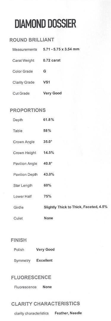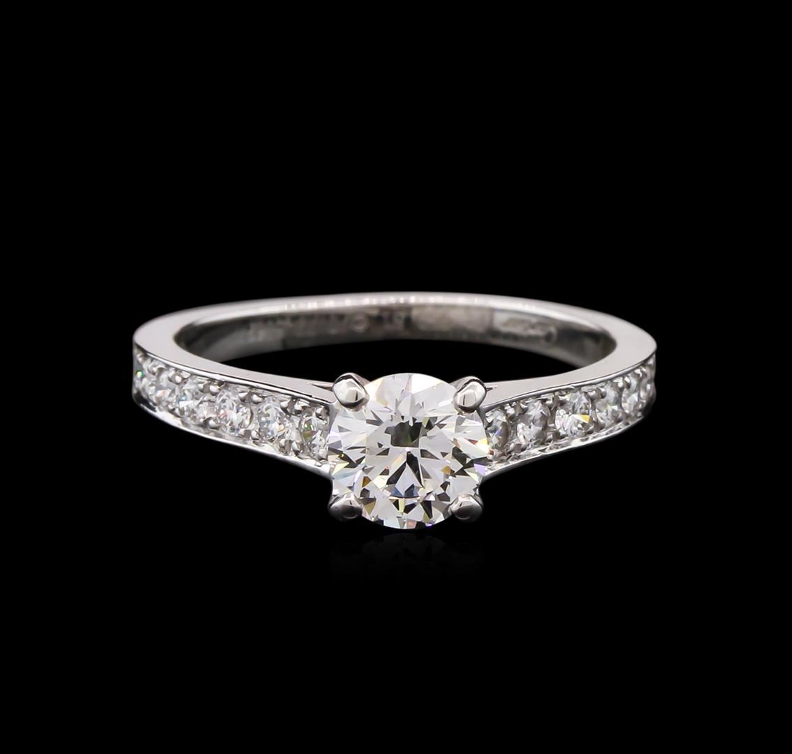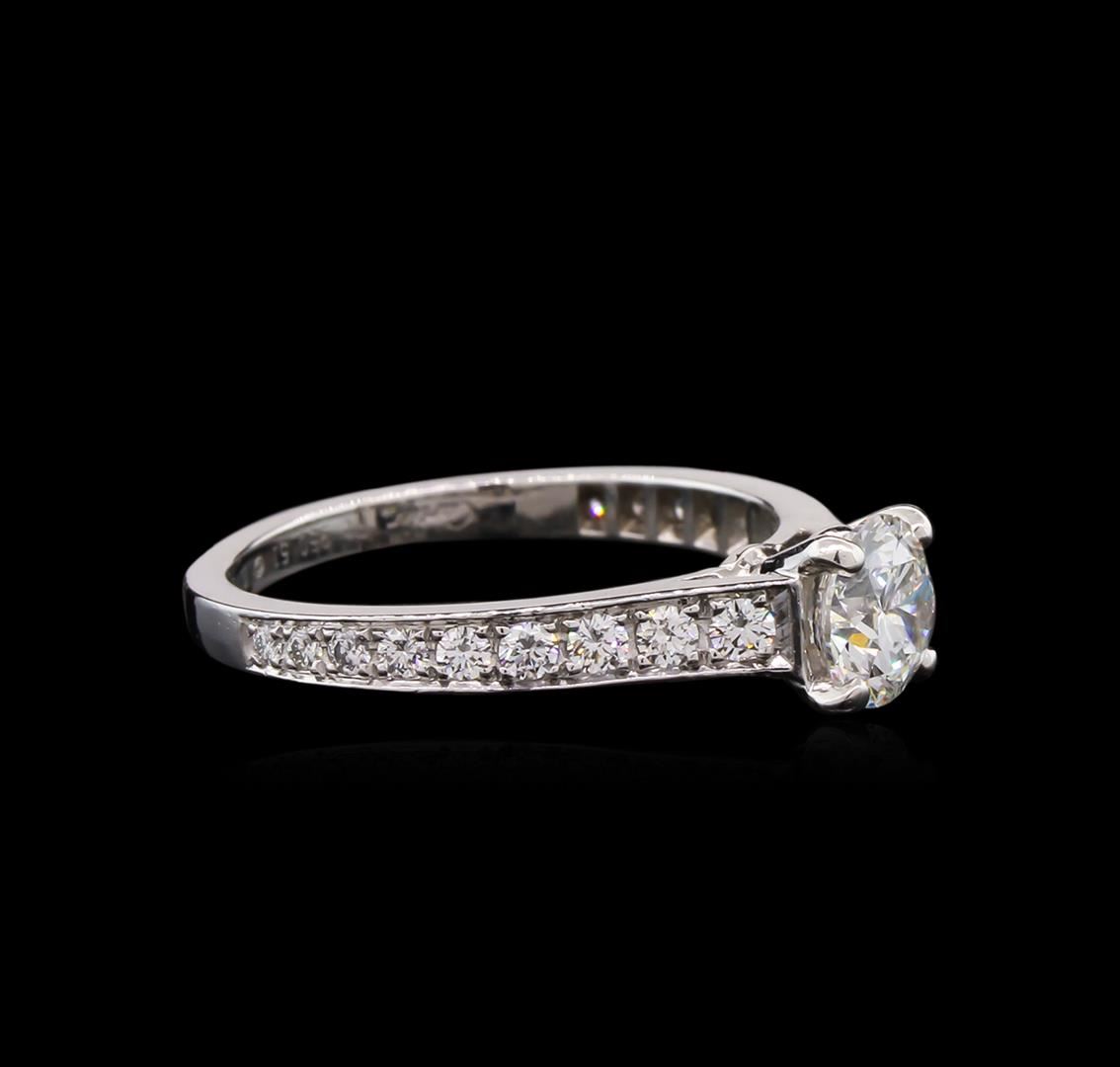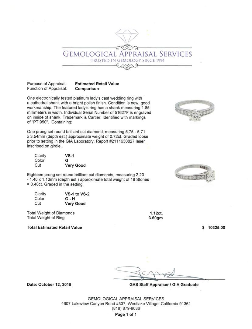 One electronically tested platinum lady's cast wedding ring with a cathedral shank with a bright polish finish. The featured lady's ring has a shank measuring 1.85 millimeters in width. Individual Serial Number of 51627F is engraved on inside of shank. Trademark is Cartier. Identified with markings of "PT 950". Condition is new, good workmanship. Containing: One prong set round brilliant cut diamond, measuring 5.75 - 5.71 x 3.54mm (depth est.) approximate weight of 0.72ct. Graded loose prior to setting in the GIA Laboratory, Report #2111630827 laser inscribed on girdle. Clarity: VS-1. Color: Very Good Eighteen prong set round brilliant cut diamonds, measuring 2.20 - 1.40 x 1.13mm (depth est.) approximate total weight of 18 Stones = 0.40ct. Graded in the setting. Clarity: VS-1 to VS-2. Color: G - Very Good. Total Weight of Diamonds 1.12ct. Total Weight of Ring 3.60gm. GAS Appraised at $10,325.00.