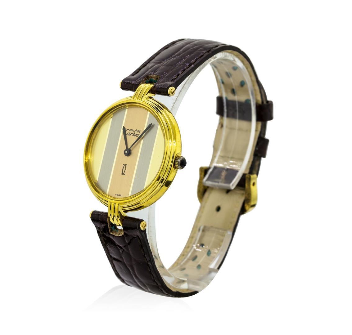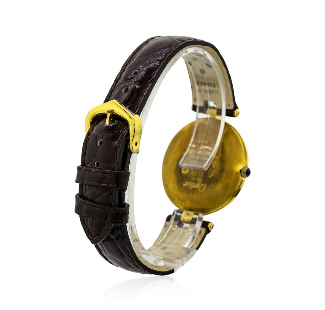 One lady's Cartier watch featuring: leather strap attached to a gold toned silver case measuring approximately 31 millimeters in diameter with a quartz movement and narrow baton type hands. The case and strap weigh a total of 28.7 grams.