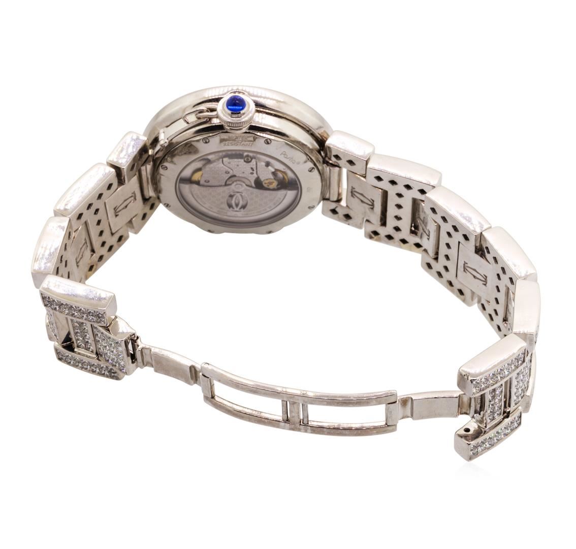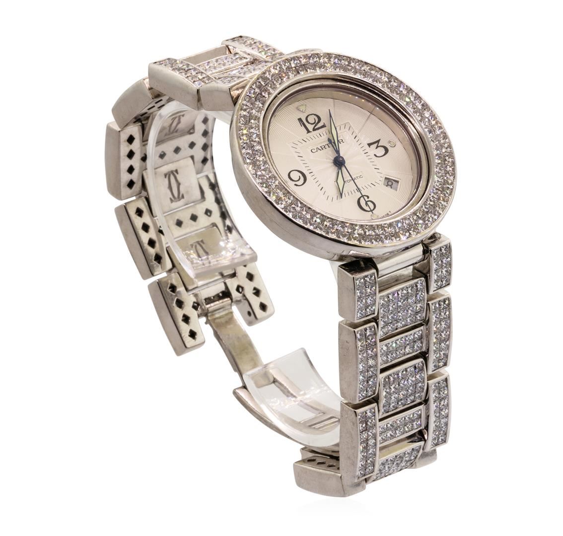 One men's Cartier Pasha stainless steel wristwatch with custom diamonds with an attached diamond-set stainless steel bracelet. Serial #: CC497341, Model #: 2378. Crown: pull-out with attached sapphire-set screw-down cap. Bezel: custom double row diamond. Crystal: synthetic sapphire. Movement: automatic, 27 jewel with skeleton back. Dial: champagne color with arabic numerals. Calendar: in between 4 and 5 o'clock. Bracelet: matching diamond set with double deployment clasp. The total weight of the watch is 169.4 grams.