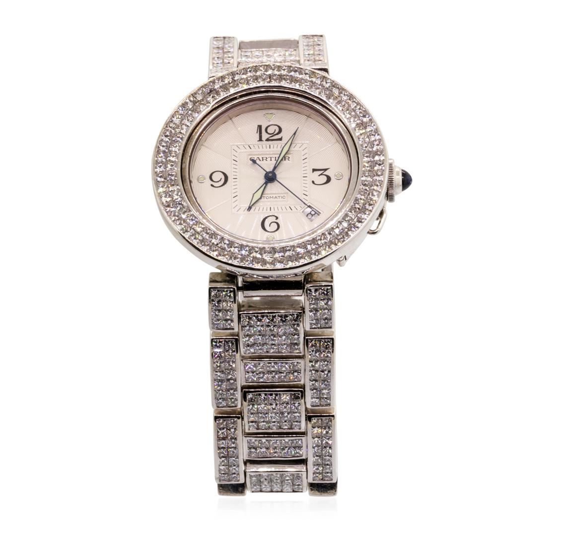 One men's Cartier Pasha stainless steel wristwatch with custom diamonds with an attached diamond-set stainless steel bracelet. Serial #: CC497341, Model #: 2378. Crown: pull-out with attached sapphire-set screw-down cap. Bezel: custom double row diamond. Crystal: synthetic sapphire. Movement: automatic, 27 jewel with skeleton back. Dial: champagne color with arabic numerals. Calendar: in between 4 and 5 o'clock. Bracelet: matching diamond set with double deployment clasp. The total weight of the watch is 169.4 grams.