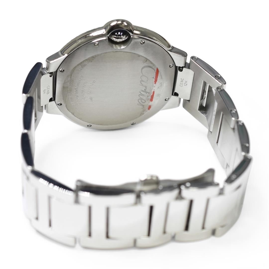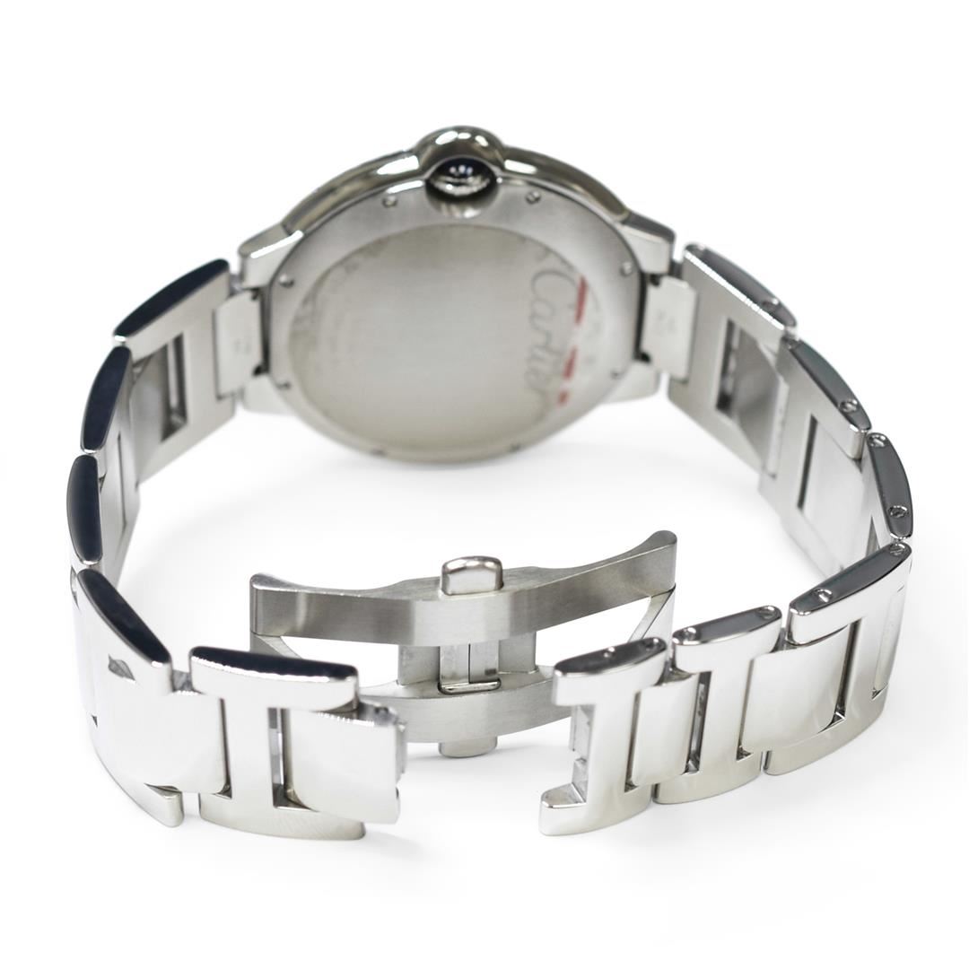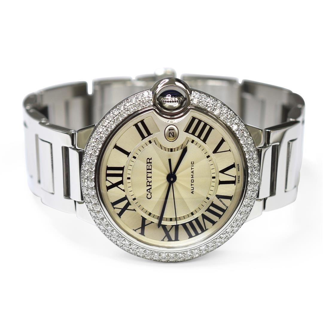 Cartier Ballon Bleu Mens 42mm Silver Roman Dial Custom Diamond Bezel Steel Polished & Electronically Tested. Model: Ballon Bleu 3001. Case: Stainless Steel. Bezel: Custom made diamond bezel with round brilliant diamonds all set in prong setting. Total Weight 2.00ctw Clarity: VS-SI Color:G-H. Crystal: Sapphire. Bracelet: Stainless Steel. Dial: Original Silver Color Roman Numerals. Date Window: 3 O'clock Position date display. Movement: Automatic Winding Movement. Water Resistant: Yes. Case Size: 42mm. Condition: Pre Owned, Watch is free of all Scratches and Dents, Extra Fine G-6.